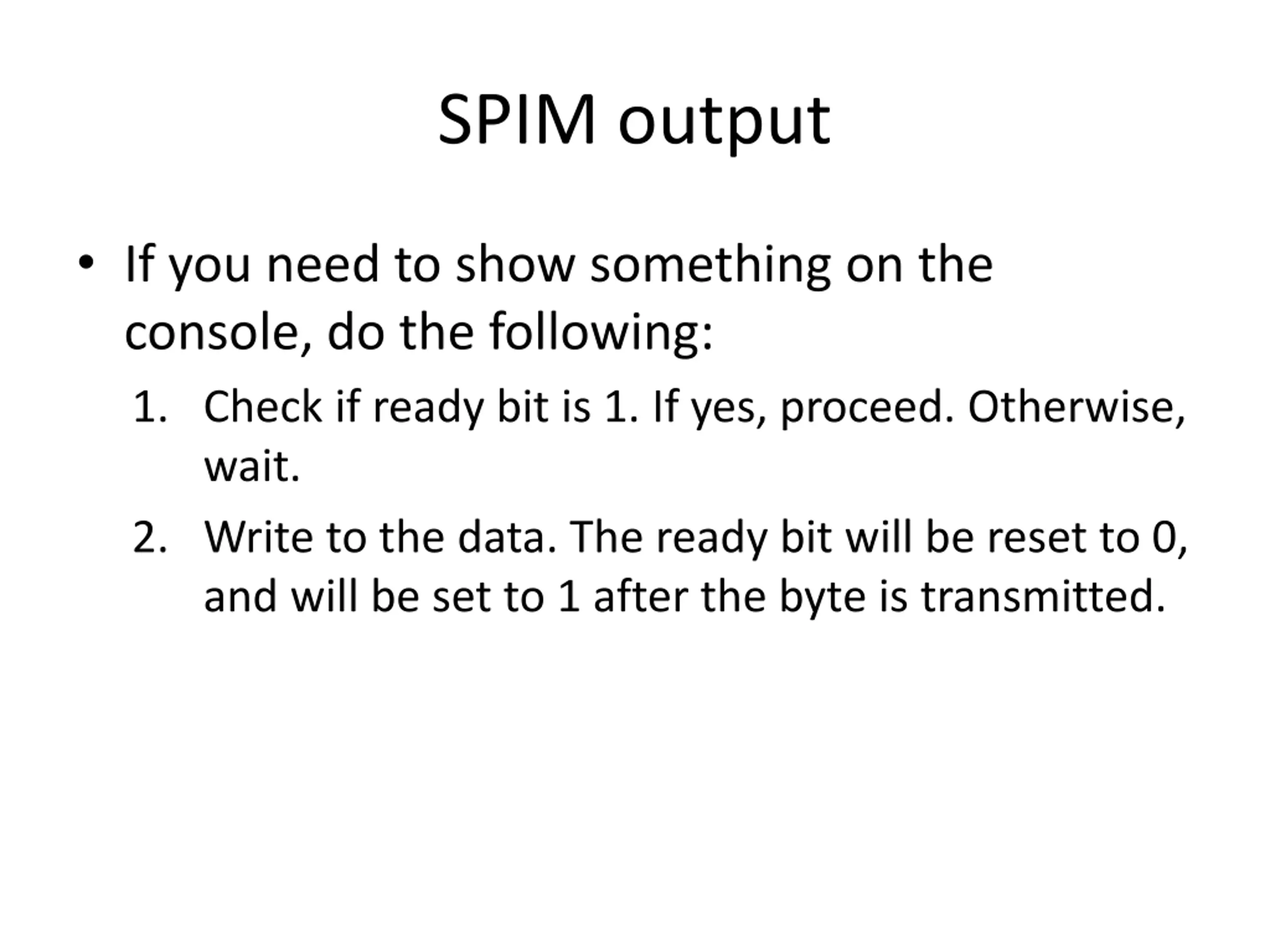 SPIM output If you need to show something on the console, do the following: 1. Check if ready bit is 1. If yes, proceed. Otherwise, wait. 2. Write to the data. The ready bit will be reset to 0, and will be set to 1 after the byte is transmitted.