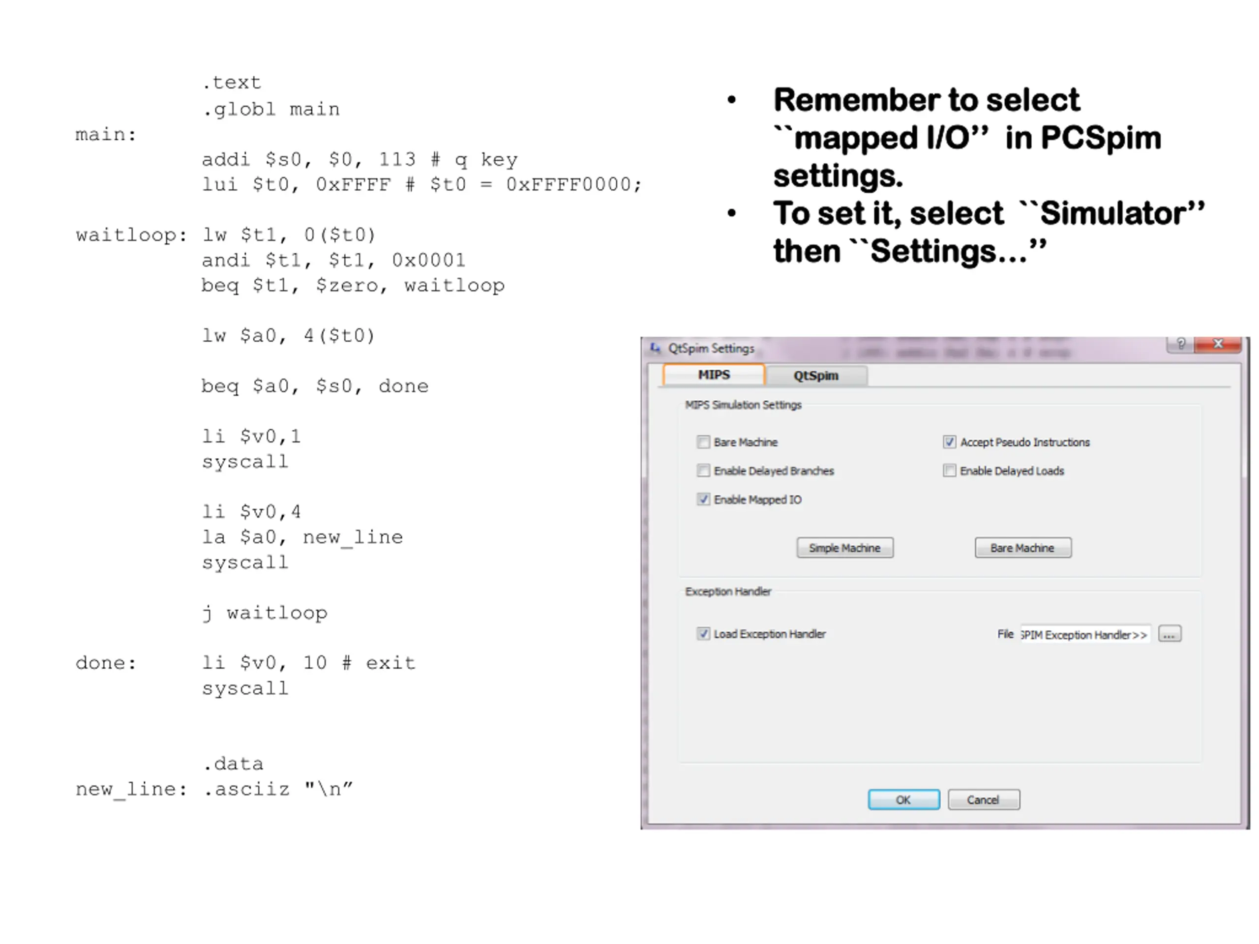 .text .globl main Remember to select Remember to select ``mapped I/O in PCSpim ``mapped I/O in PCSpim settings. settings. To set it, select ``Simulator To set it, select ``Simulator then ``Settings then ``Settings main: waitloop: lw $t1, 0($t0) andi $t1, $t1, 0x0001 beq $t1, $zero, waitloop addi $s0, $0, 113 # q key lui $t0, 0xFFFF # $t0 = 0xFFFF0000; lw $a0, 4($t0) beq $a0, $s0, done li $v0,1 syscall li $v0,4 la $a0, new_line syscall done: j waitloop li $v0, 10 # exit syscall new_line: .asciiz "\n .data