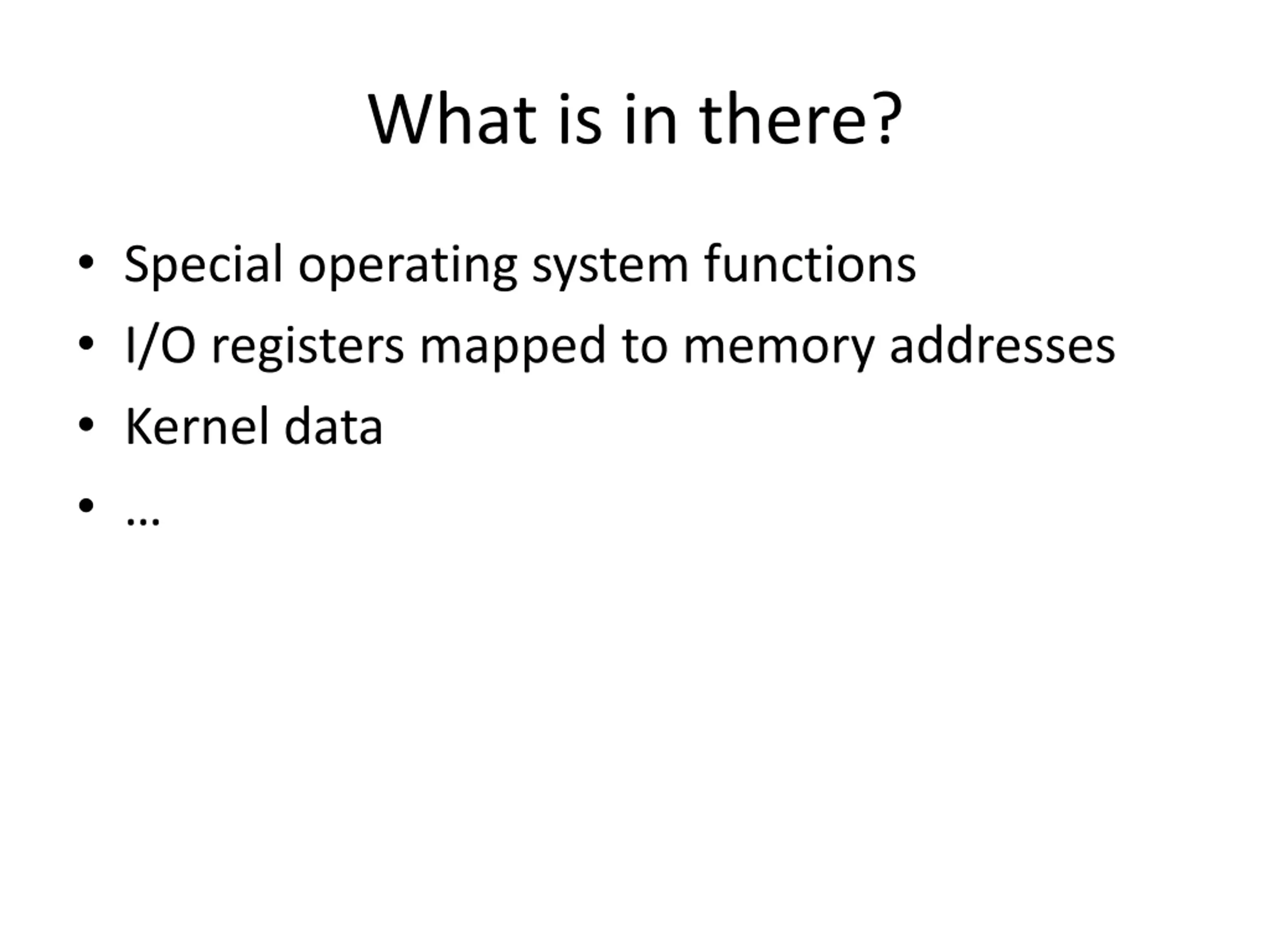 What is in there? Special operating system functions I/O registers mapped to memory addresses Kernel data