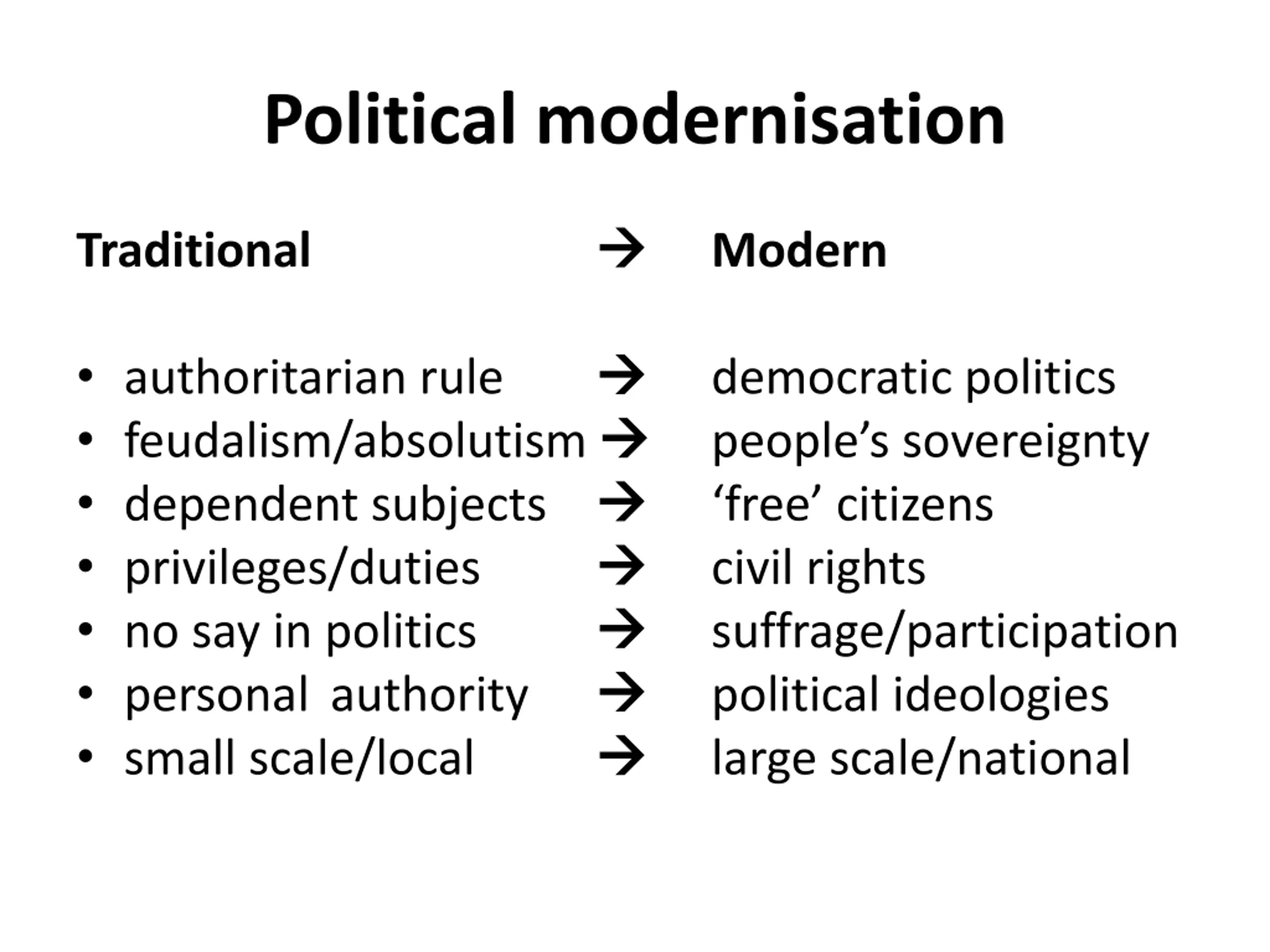 Political modernisation Traditional Modern authoritarian rule feudalism/absolutism dependent subjects privileges/duties no say in politics personal authority small scale/local democratic politics people s sovereignty free citizens civil rights suffrage/participation political ideologies large scale/national