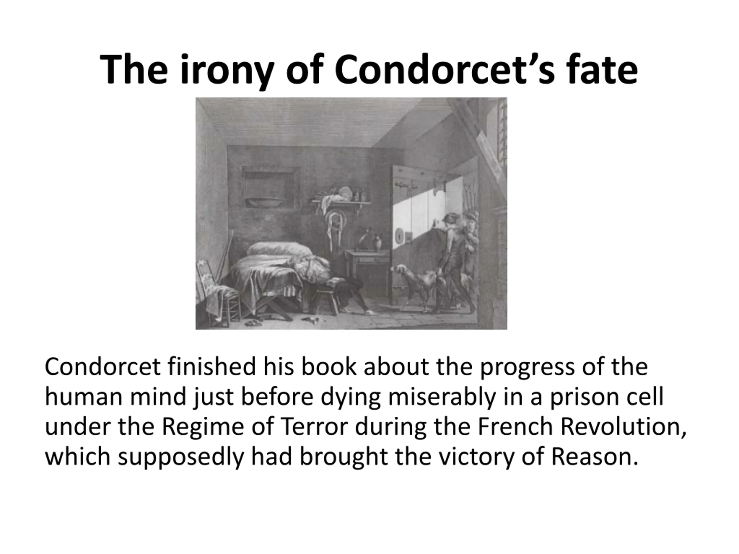 The irony of Condorcets fate Condorcet finished his book about the progress of the human mind just before dying miserably in a prison cell under the Regime of Terror during the French Revolution, which supposedly had brought the victory of Reason.