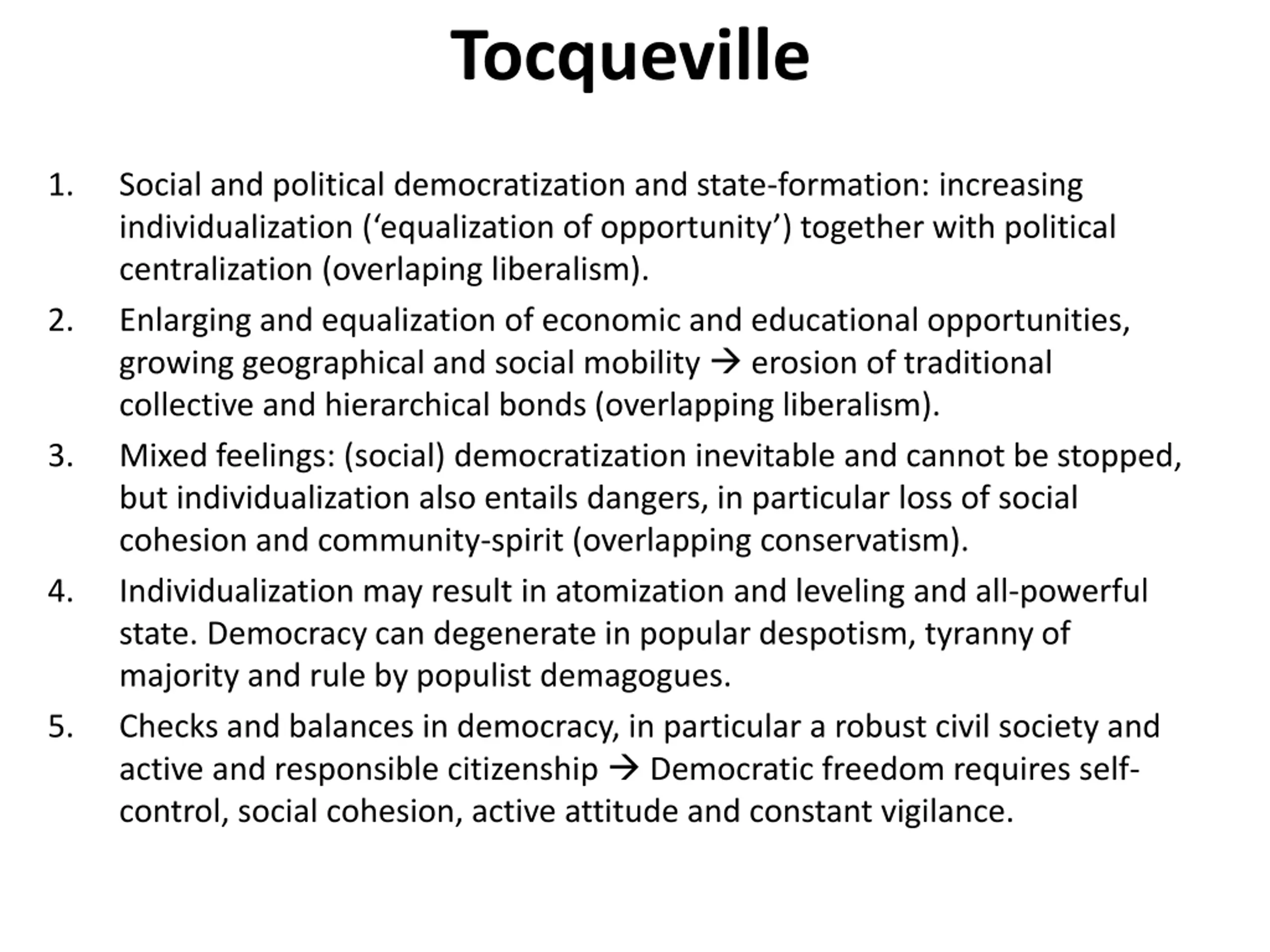 Tocqueville 1. Social and political democratization and state-formation: increasing individualization ( equalization of opportunity ) together with political centralization (overlaping liberalism). Enlarging and equalization of economic and educational opportunities, growing geographical and social mobility erosion of traditional collective and hierarchical bonds (overlapping liberalism). Mixed feelings: (social) democratization inevitable and cannot be stopped, but individualization also entails dangers, in particular loss of social cohesion and community-spirit (overlapping conservatism). Individualization may result in atomization and leveling and all-powerful state. Democracy can degenerate in popular despotism, tyranny of majority and rule by populist demagogues. Checks and balances in democracy, in particular a robust civil society and active and responsible citizenship Democratic freedom requires self- control, social cohesion, active attitude and constant vigilance. 2. 3. 4. 5.