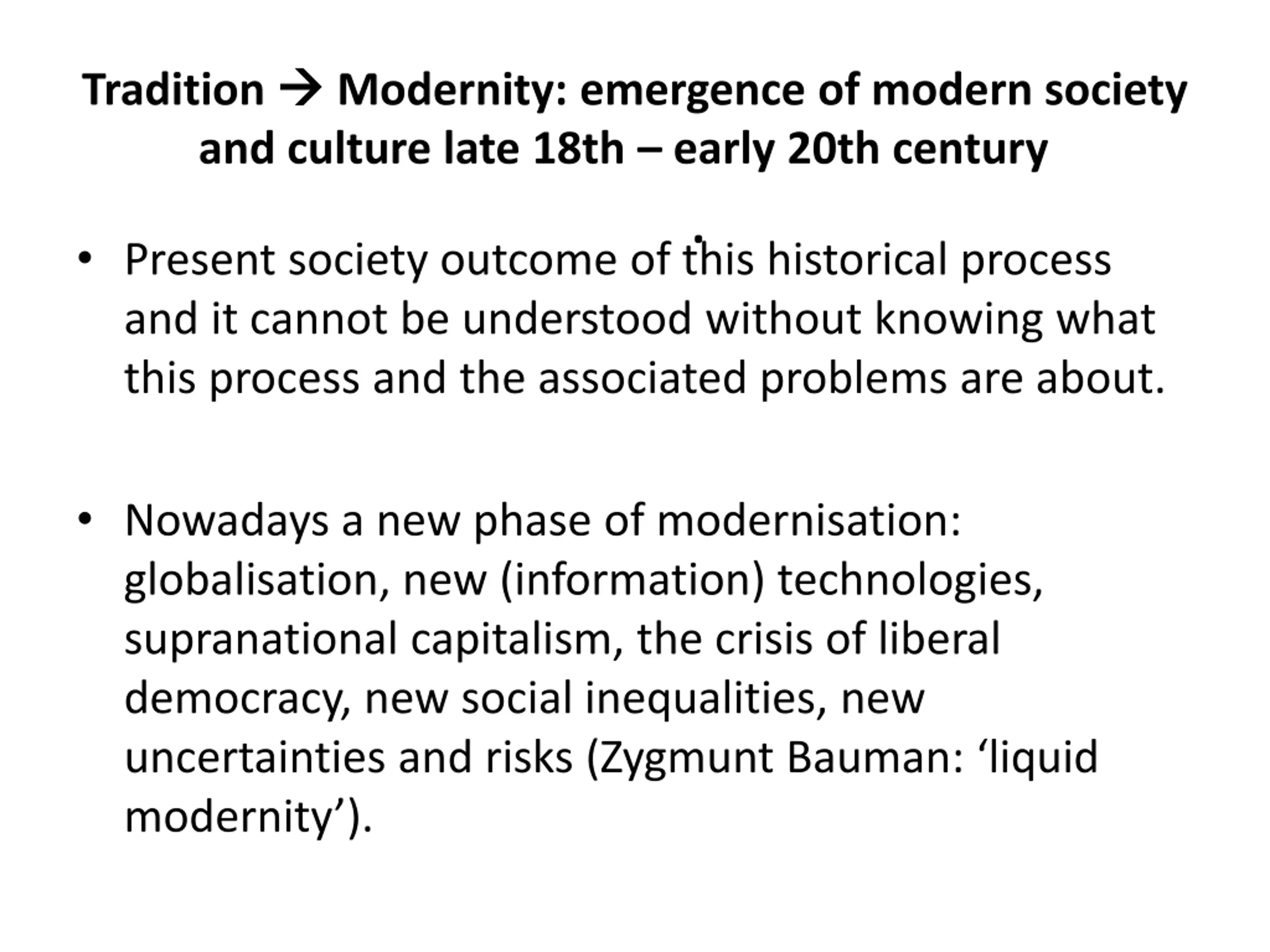 Tradition and culture late 18th early 20th century Modernity: emergence of modern society . Present society outcome of this historical process and it cannot be understood without knowing what this process and the associated problems are about. Nowadays a new phase of modernisation: globalisation, new (information) technologies, supranational capitalism, the crisis of liberal democracy, new social inequalities, new uncertainties and risks (Zygmunt Bauman: liquid modernity ).