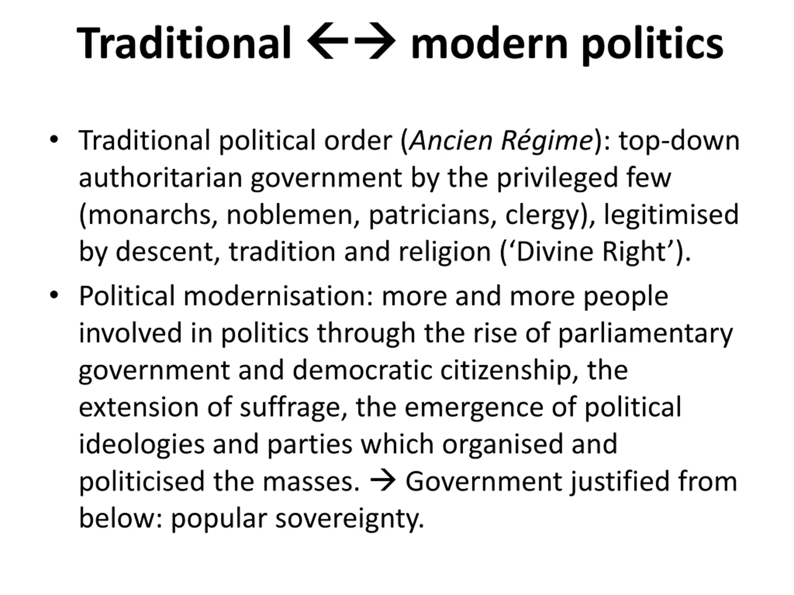 Traditional modern politics Traditional political order (Ancien R gime): top-down authoritarian government by the privileged few (monarchs, noblemen, patricians, clergy), legitimised by descent, tradition and religion ( Divine Right ). Political modernisation: more and more people involved in politics through the rise of parliamentary government and democratic citizenship, the extension of suffrage, the emergence of political ideologies and parties which organised and politicised the masses. Government justified from below: popular sovereignty.