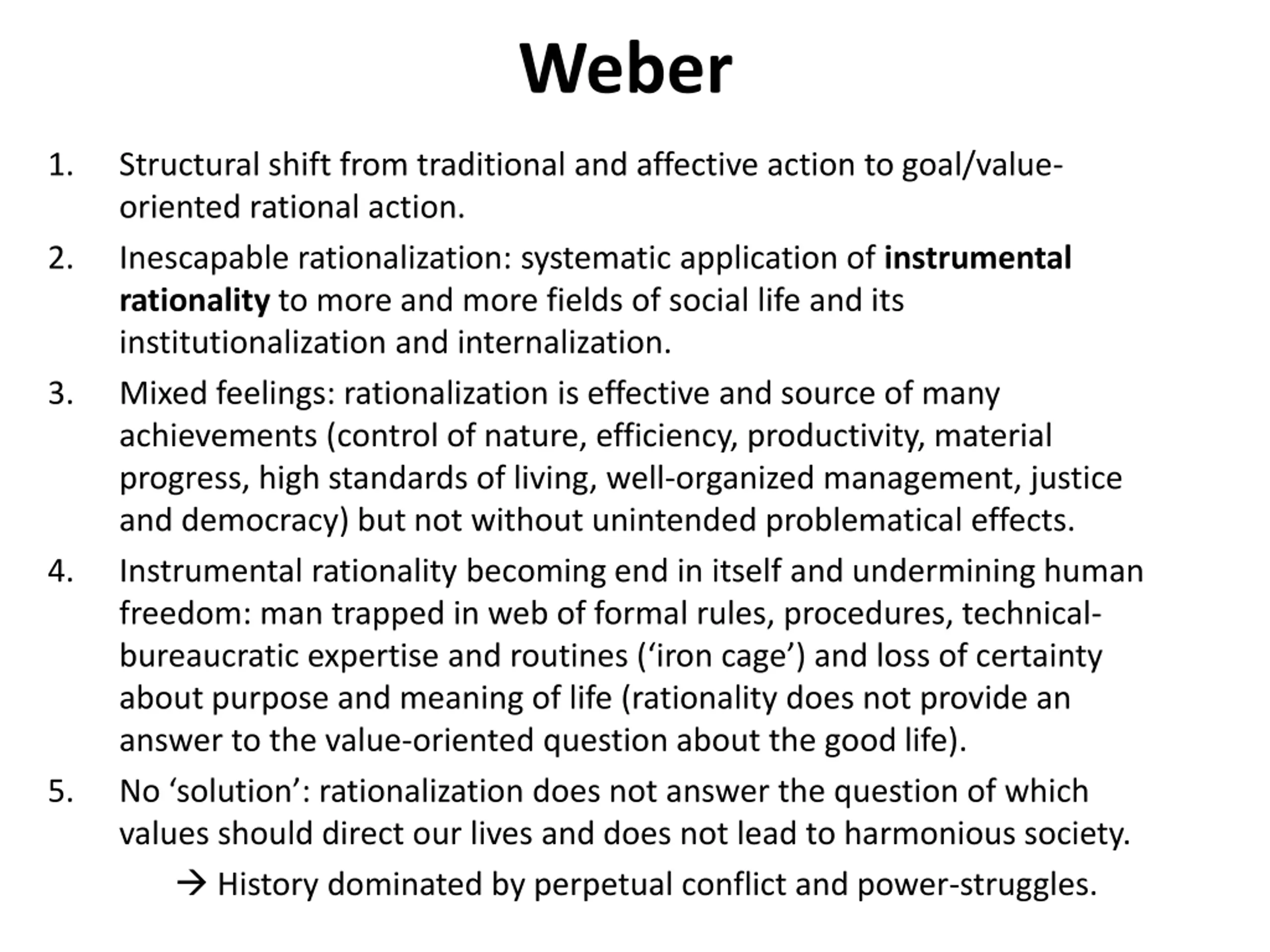 Weber 1. Structural shift from traditional and affective action to goal/value- oriented rational action. Inescapable rationalization: systematic application of instrumental rationality to more and more fields of social life and its institutionalization and internalization. Mixed feelings: rationalization is effective and source of many achievements (control of nature, efficiency, productivity, material progress, high standards of living, well-organized management, justice and democracy) but not without unintended problematical effects. Instrumental rationality becoming end in itself and undermining human freedom: man trapped in web of formal rules, procedures, technical- bureaucratic expertise and routines ( iron cage ) and loss of certainty about purpose and meaning of life (rationality does not provide an answer to the value-oriented question about the good life). No solution : rationalization does not answer the question of which values should direct our lives and does not lead to harmonious society. History dominated by perpetual conflict and power-struggles. 2. 3. 4. 5.