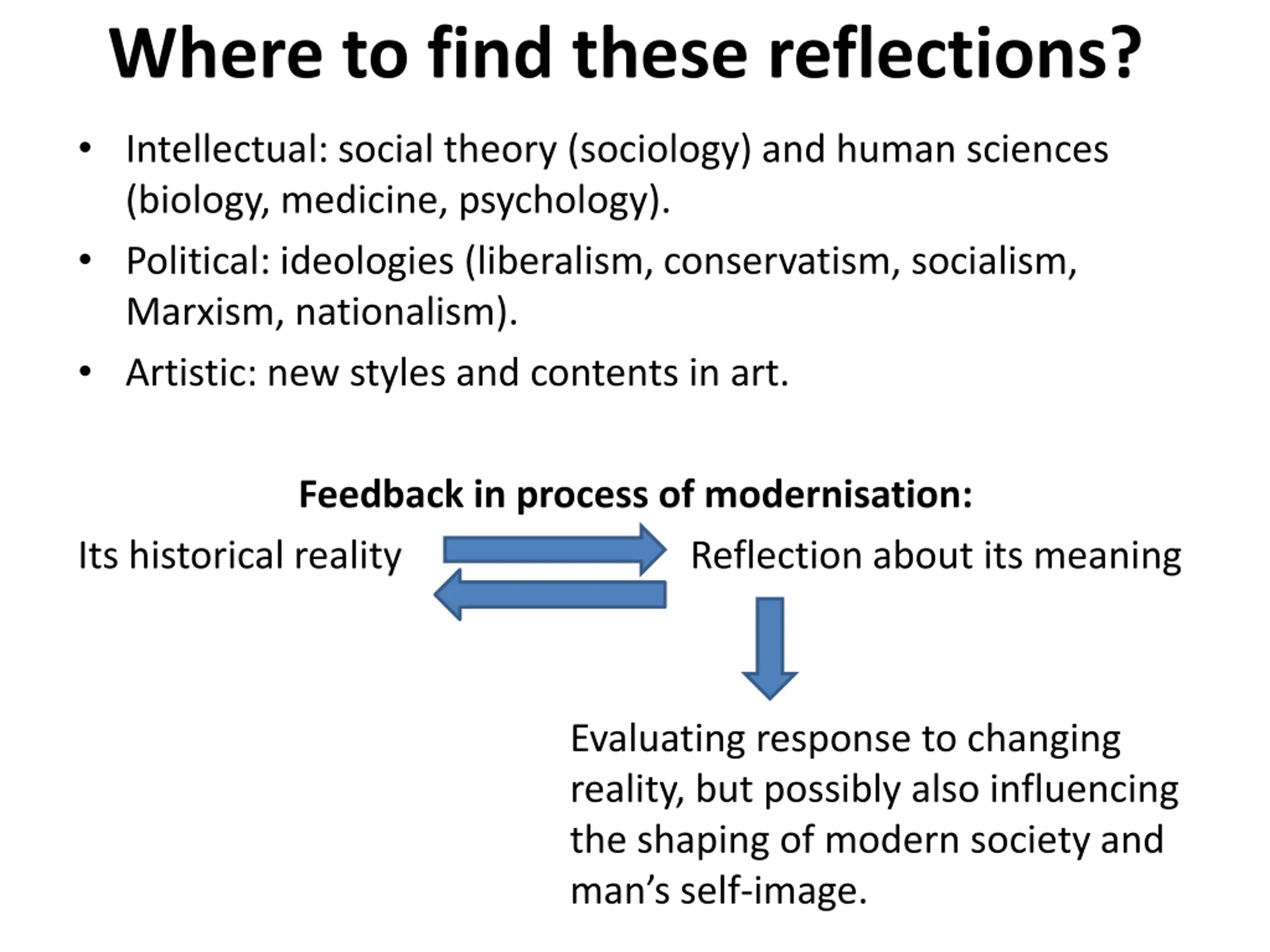 Where to find these reflections? Intellectual: social theory (sociology) and human sciences (biology, medicine, psychology). Political: ideologies (liberalism, conservatism, socialism, Marxism, nationalism). Artistic: new styles and contents in art. Feedback in process of modernisation: Its historical reality Reflection about its meaning Evaluating response to changing reality, but possibly also influencing the shaping of modern society and man s self-image.