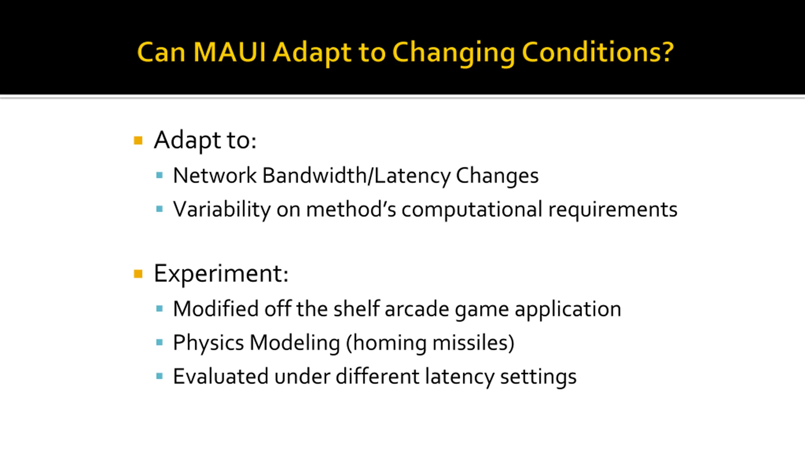 Adapt to: Network Bandwidth/Latency Changes Variability on method s computational requirements Experiment: Modified off the shelf arcade game application Physics Modeling (homing missiles) Evaluated under different latency settings