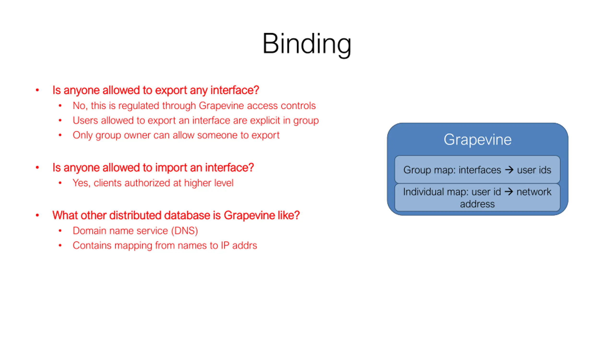 Binding Is anyone allowed to export any interface? Is anyone allowed to export any interface? No, this is regulated through Grapevine access controls Users allowed to export an interface are explicit in group Only group owner can allow someone to export Grapevine Is anyone allowed to import an interface? Is anyone allowed to import an interface? Yes, clients authorized at higher level Group map: interfaces user ids Individual map: user id network address What other distributed database is Grapevine like? What other distributed database is Grapevine like? Domain name service (DNS) Contains mapping from names to IP addrs