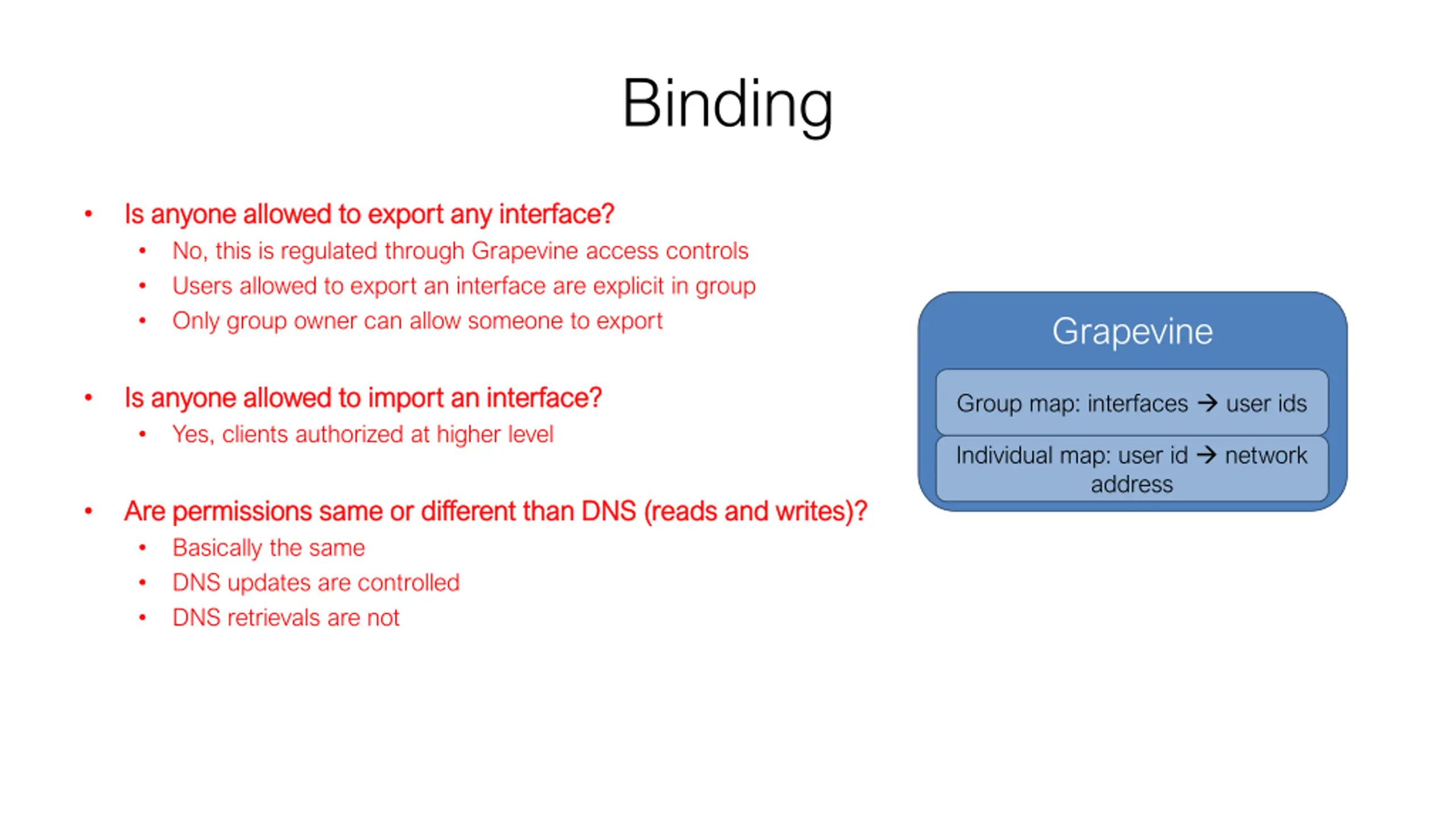 Binding Is anyone allowed to export any interface? Is anyone allowed to export any interface? No, this is regulated through Grapevine access controls Users allowed to export an interface are explicit in group Only group owner can allow someone to export Grapevine Is anyone allowed to import an interface? Is anyone allowed to import an interface? Yes, clients authorized at higher level Group map: interfaces user ids Individual map: user id network address Are permissions same or different than DNS (reads and writes)? Are permissions same or different than DNS (reads and writes)? Basically the same DNS updates are controlled DNS retrievals are not