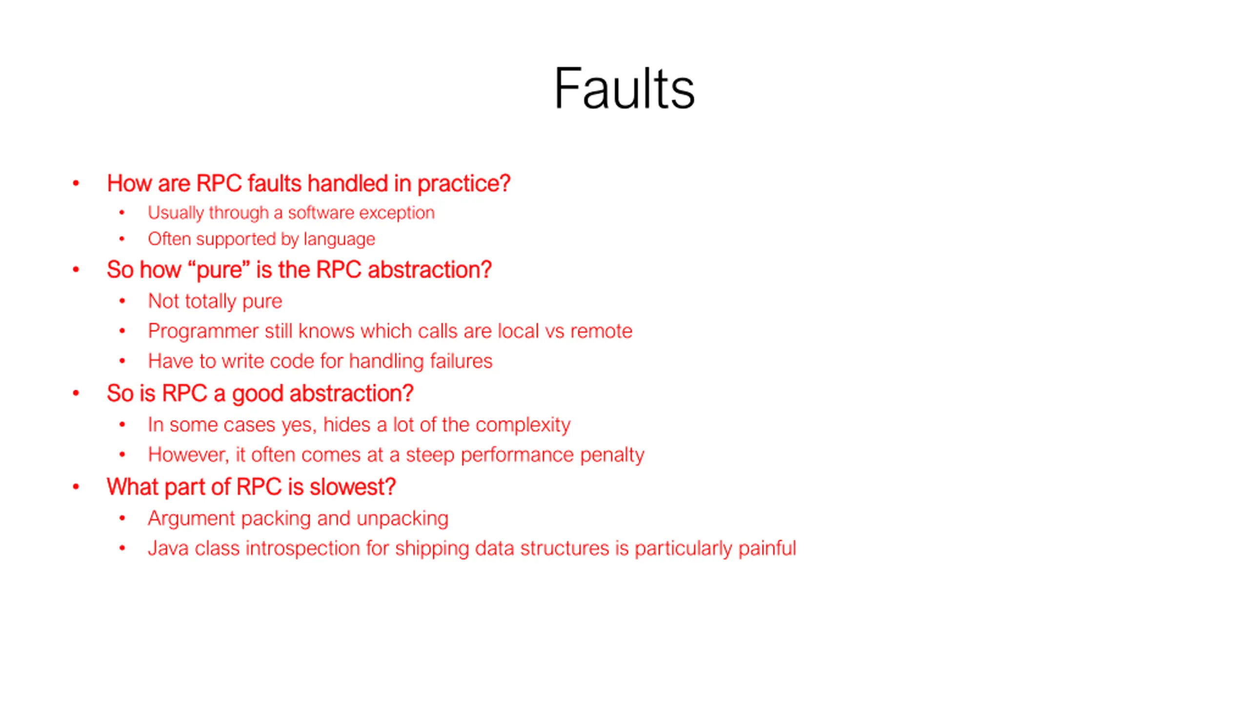 Faults How are RPC faults handled in practice? How are RPC faults handled in practice? Usually through a software exception Often supported by language So how pure is the RPC abstraction? So how pure is the RPC abstraction? Not totally pure Programmer still knows which calls are local vs remote Have to write code for handling failures So is RPC a good abstraction? So is RPC a good abstraction? In some cases yes, hides a lot of the complexity However, it often comes at a steep performance penalty What part of RPC is slowest? What part of RPC is slowest? Argument packing and unpacking Java class introspection for shipping data structures is particularly painful