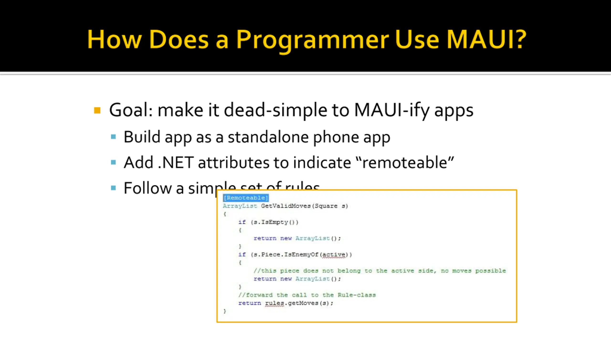 Goal: make it dead-simple to MAUI-ify apps Build app as a standalone phone app Add .NET attributes to indicate remoteable Follow a simple set of rules