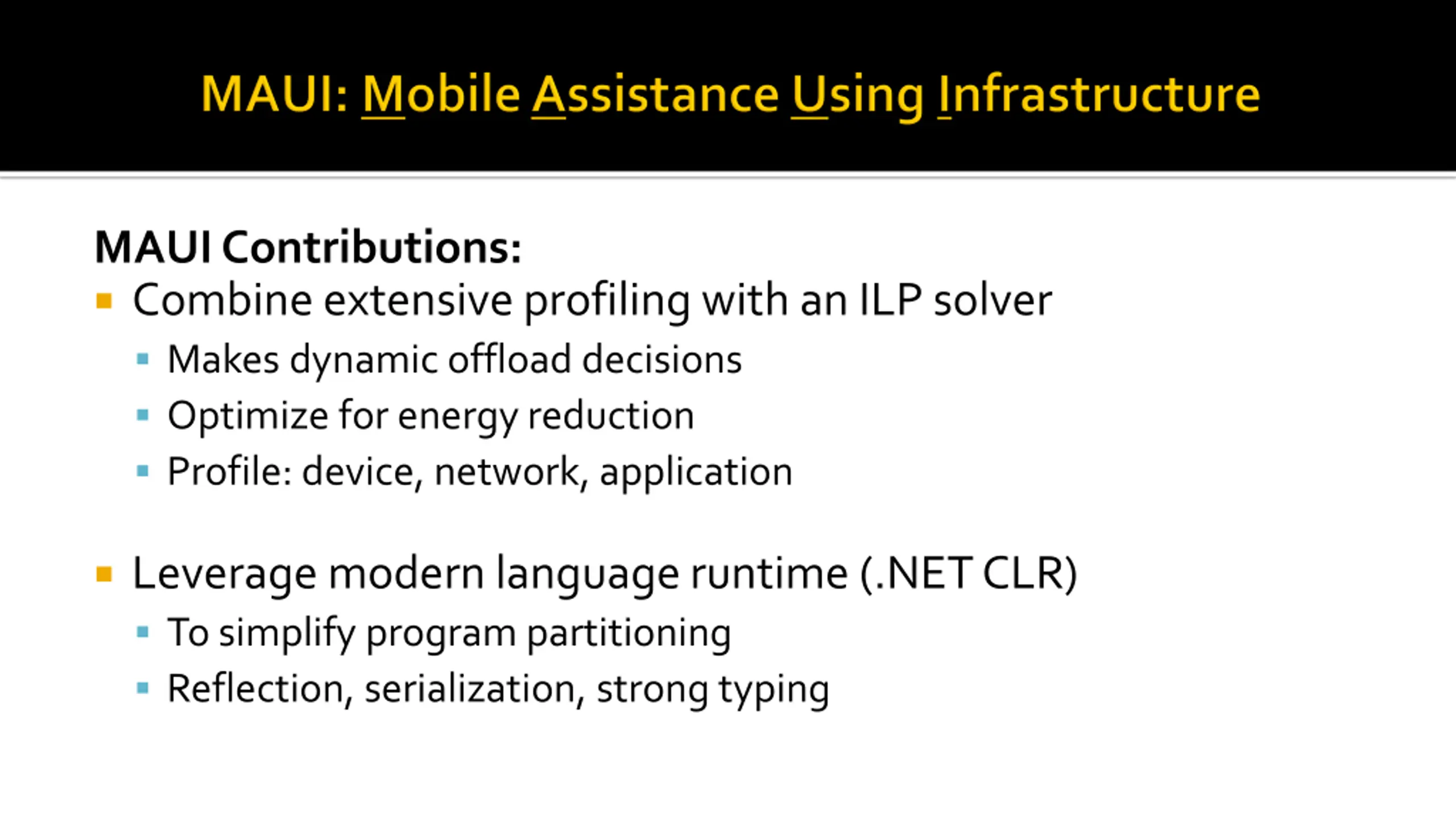 MAUI Contributions: Combine extensive profiling with an ILP solver Makes dynamic offload decisions Optimize for energy reduction Profile: device, network, application Leverage modern language runtime (.NET CLR) To simplify program partitioning Reflection, serialization, strong typing
