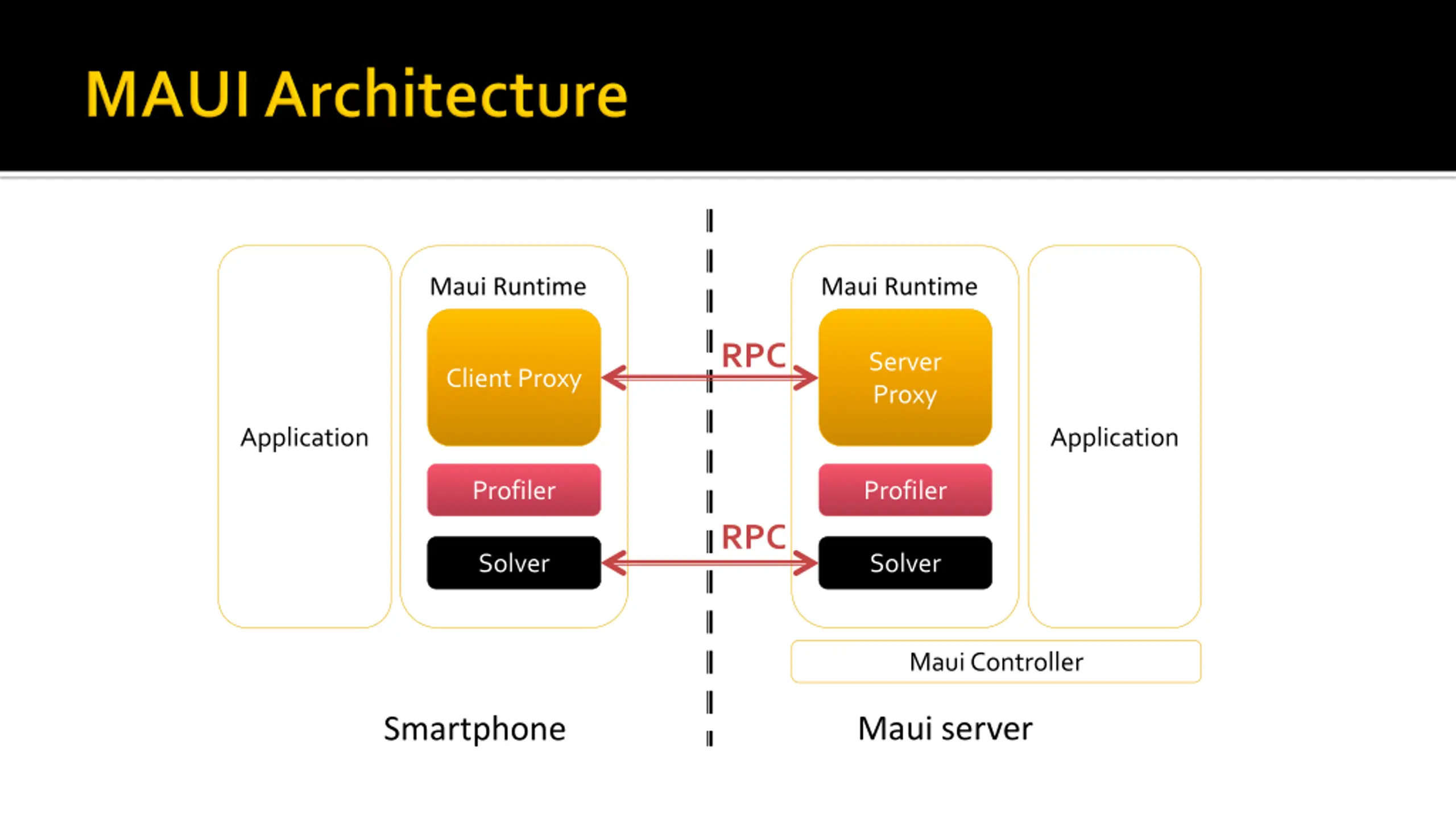 Maui Runtime Maui Runtime RPC Server Proxy Client Proxy Application Application Profiler Profiler RPC Solver Solver Maui Controller Maui server Smartphone