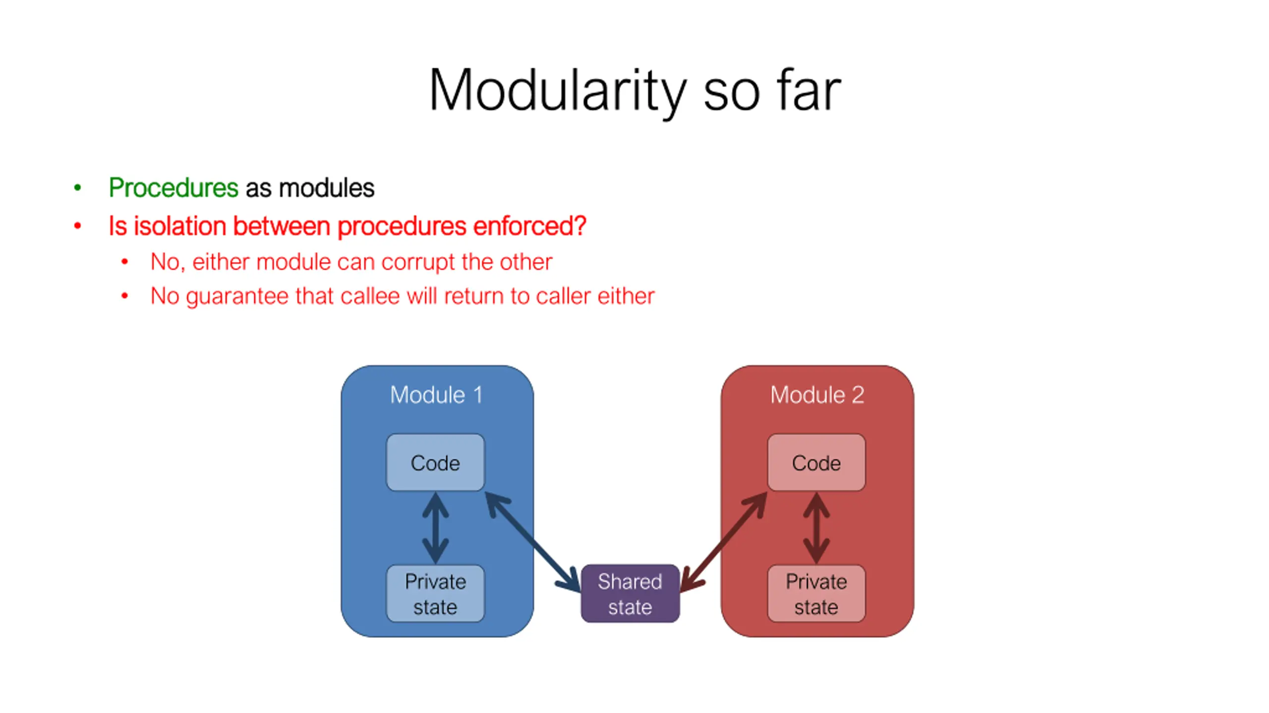 Modularity so far Procedures Procedures as modules Is isolation between procedures enforced? Is isolation between procedures enforced? No, either module can corrupt the other No guarantee that callee will return to caller either as modules Module 1 Module 2 Code Code Private state Shared state Private state
