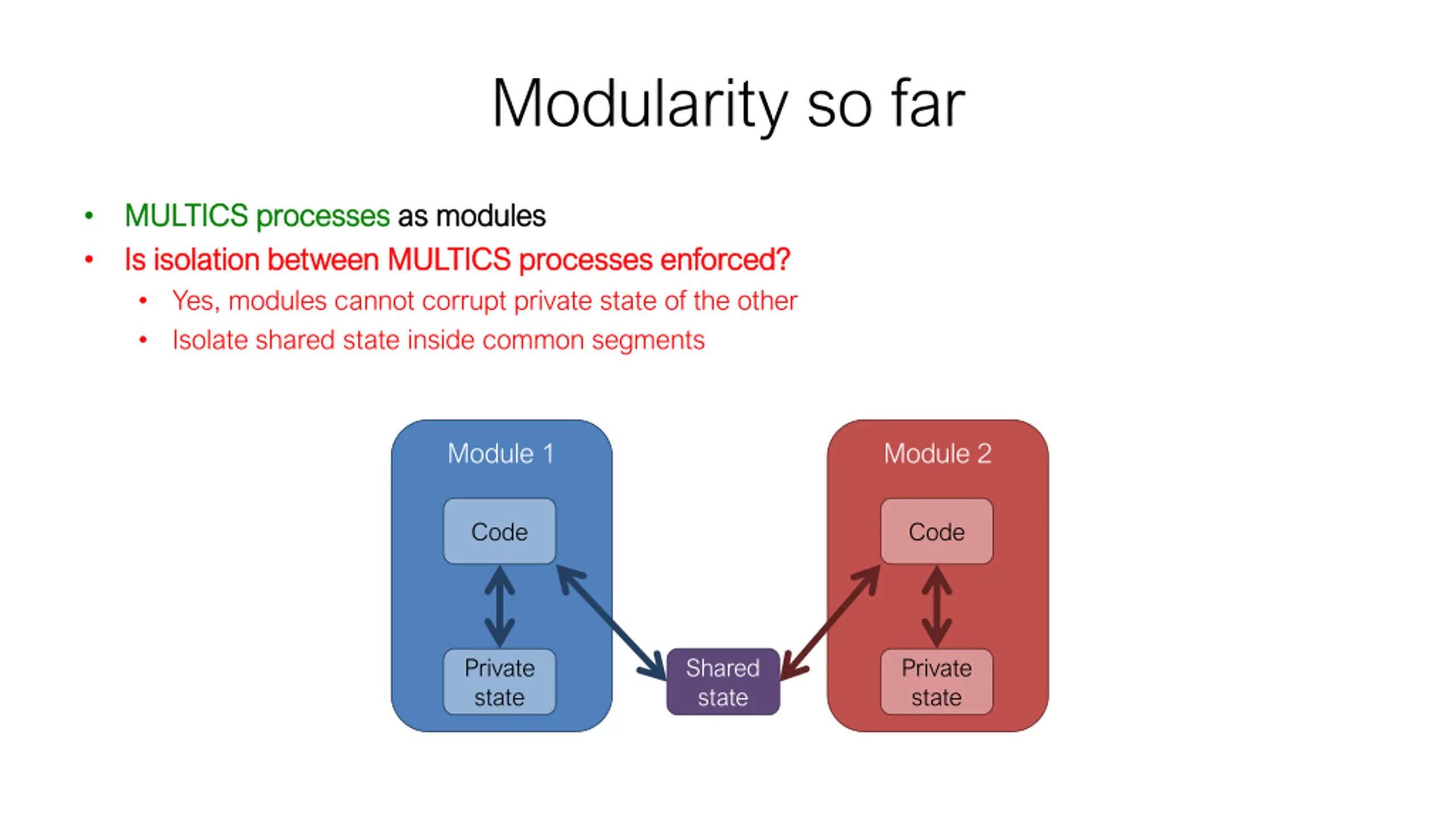 Modularity so far MULTICS processes MULTICS processes as modules Is isolation between MULTICS processes enforced? Is isolation between MULTICS processes enforced? Yes, modules cannot corrupt private state of the other Isolate shared state inside common segments as modules Module 1 Module 2 Code Code Private state Shared state Private state