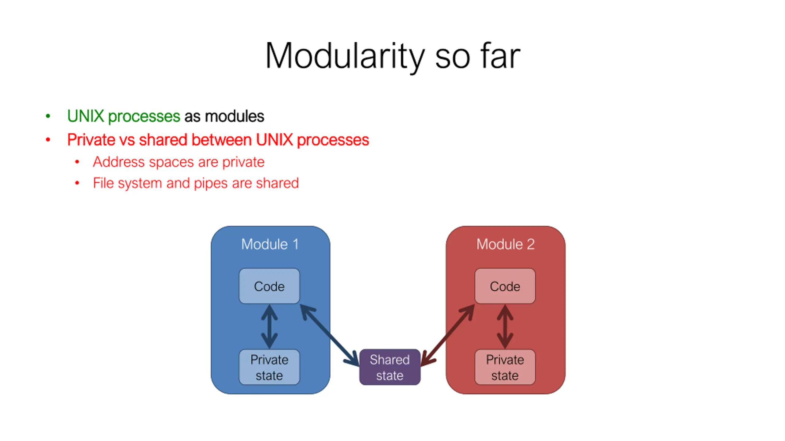 Modularity so far UNIX processes UNIX processes as modules Private vs shared between UNIX processes Private vs shared between UNIX processes Address spaces are private File system and pipes are shared as modules Module 1 Module 2 Code Code Private state Shared state Private state