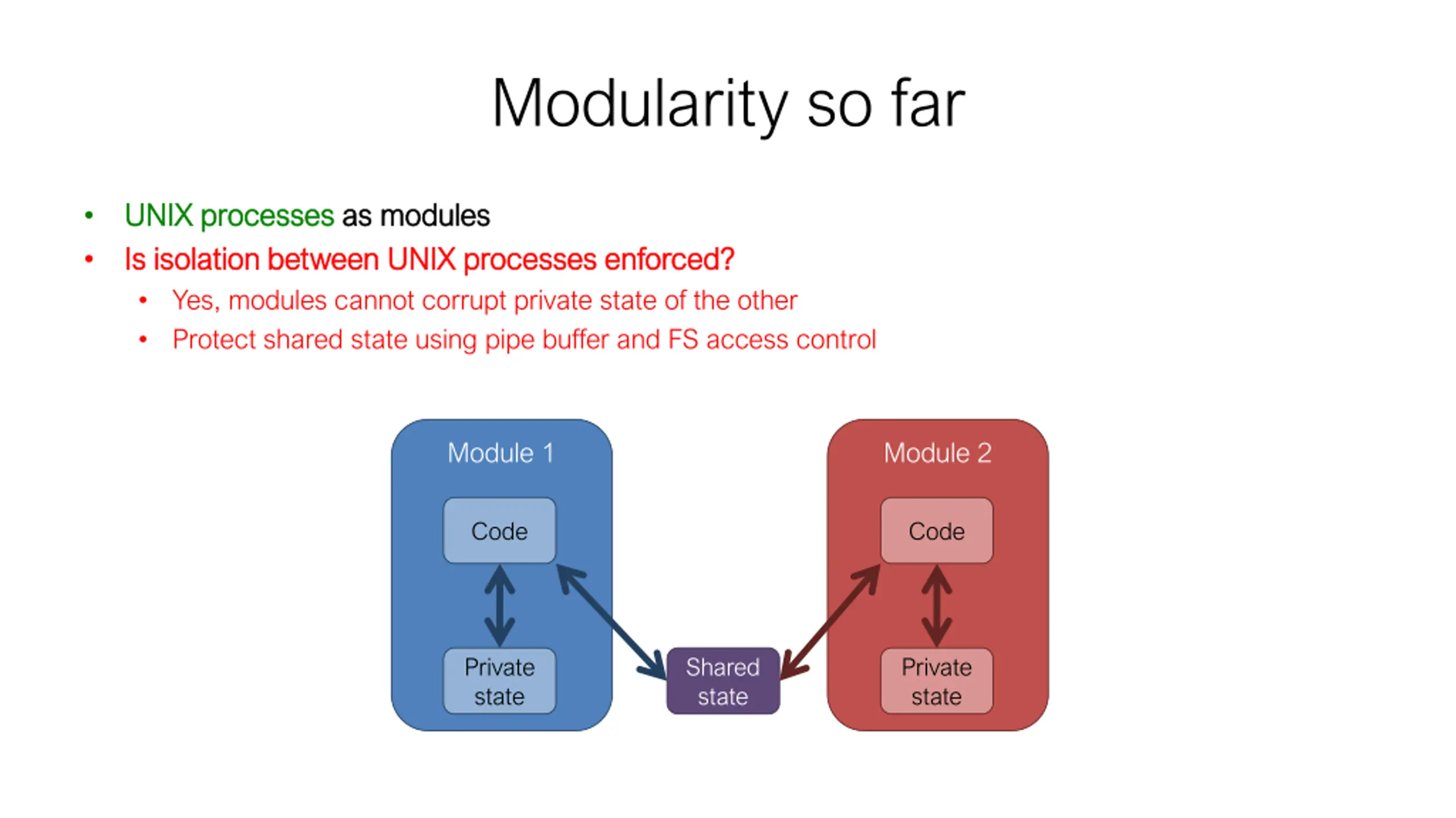 Modularity so far UNIX processes UNIX processes as modules Is isolation between UNIX processes enforced? Is isolation between UNIX processes enforced? Yes, modules cannot corrupt private state of the other Protect shared state using pipe buffer and FS access control as modules Module 1 Module 2 Code Code Private state Shared state Private state