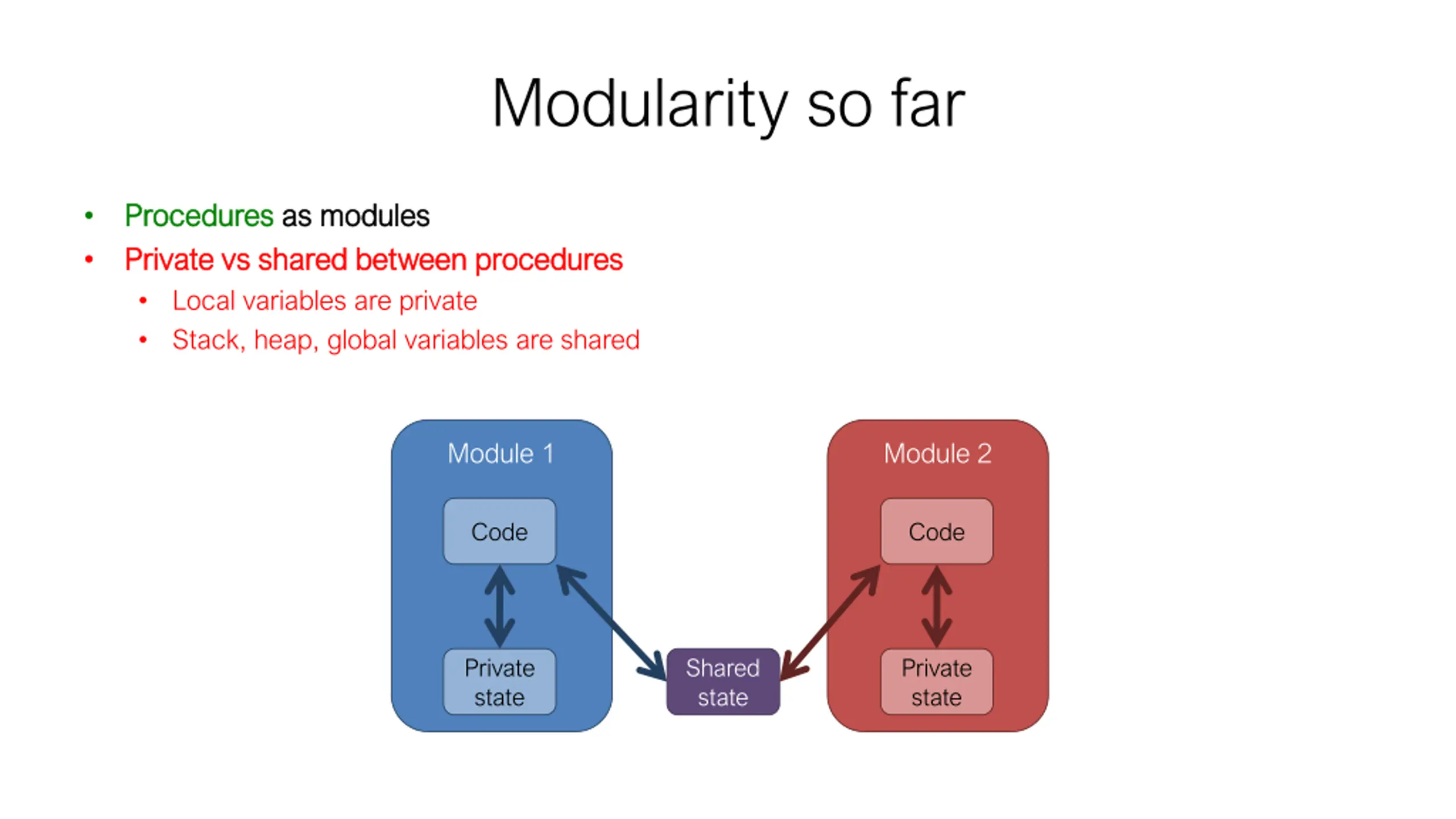 Modularity so far Procedures Procedures as modules Private vs shared between procedures Private vs shared between procedures Local variables are private Stack, heap, global variables are shared as modules Module 1 Module 2 Code Code Private state Shared state Private state