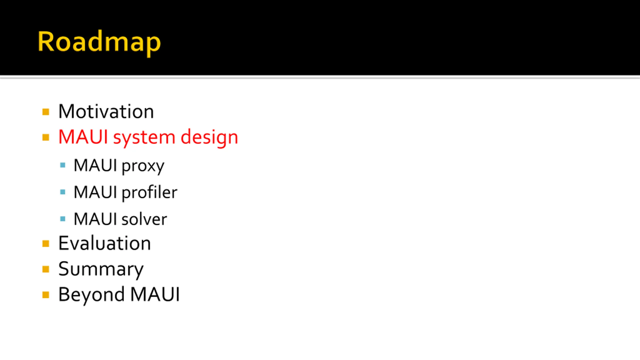 Motivation MAUI system design MAUI proxy MAUI profiler MAUI solver Evaluation Summary Beyond MAUI