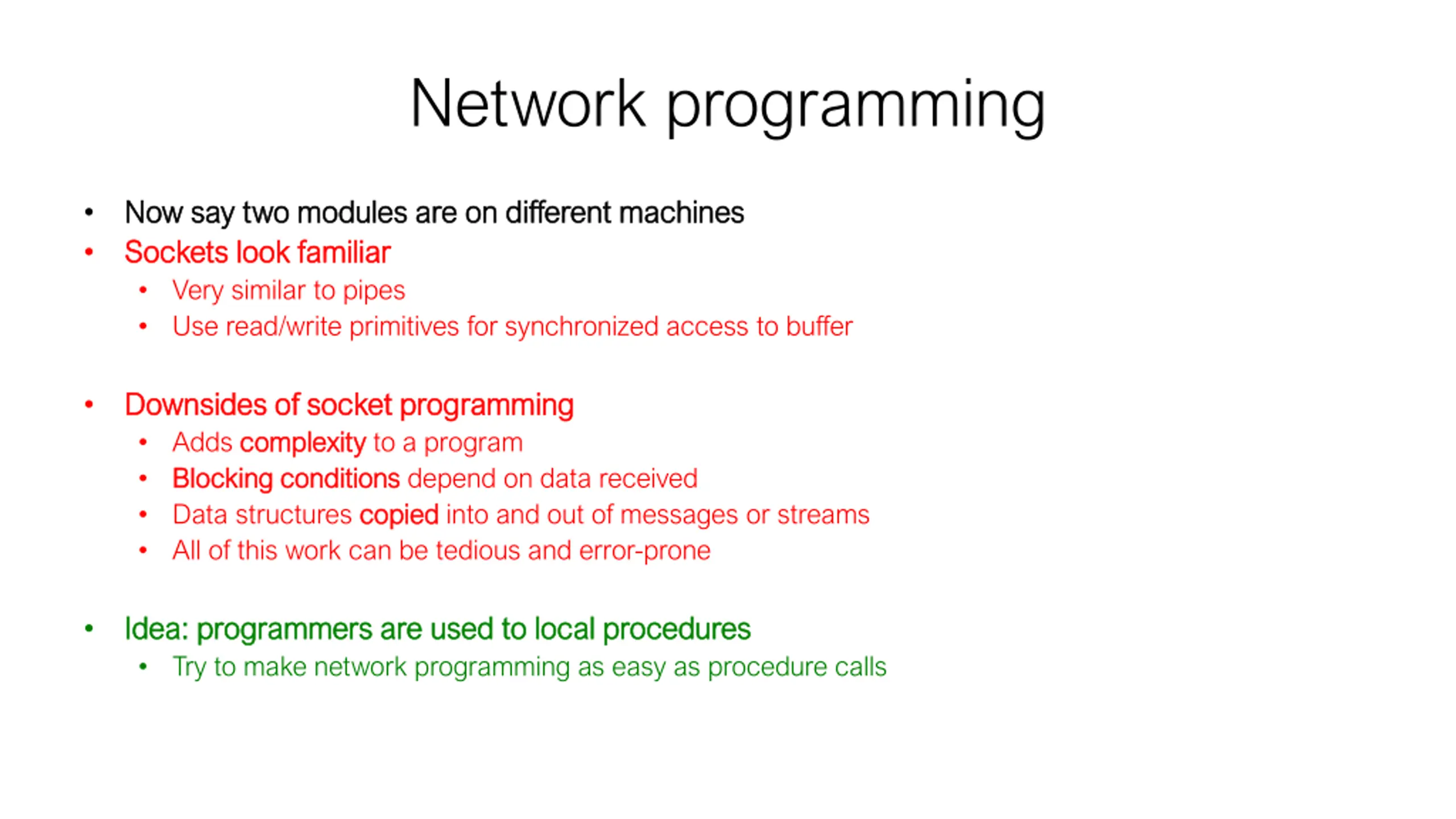 Network programming Now say two modules are on different machines Now say two modules are on different machines Sockets look familiar Sockets look familiar Very similar to pipes Use read/write primitives for synchronized access to buffer Downsides of socket programming Downsides of socket programming Adds complexity complexity to a program Blocking conditions Blocking conditions depend on data received Data structures copied copied into and out of messages or streams All of this work can be tedious and error-prone Idea: programmers are used to local procedures Idea: programmers are used to local procedures Try to make network programming as easy as procedure calls