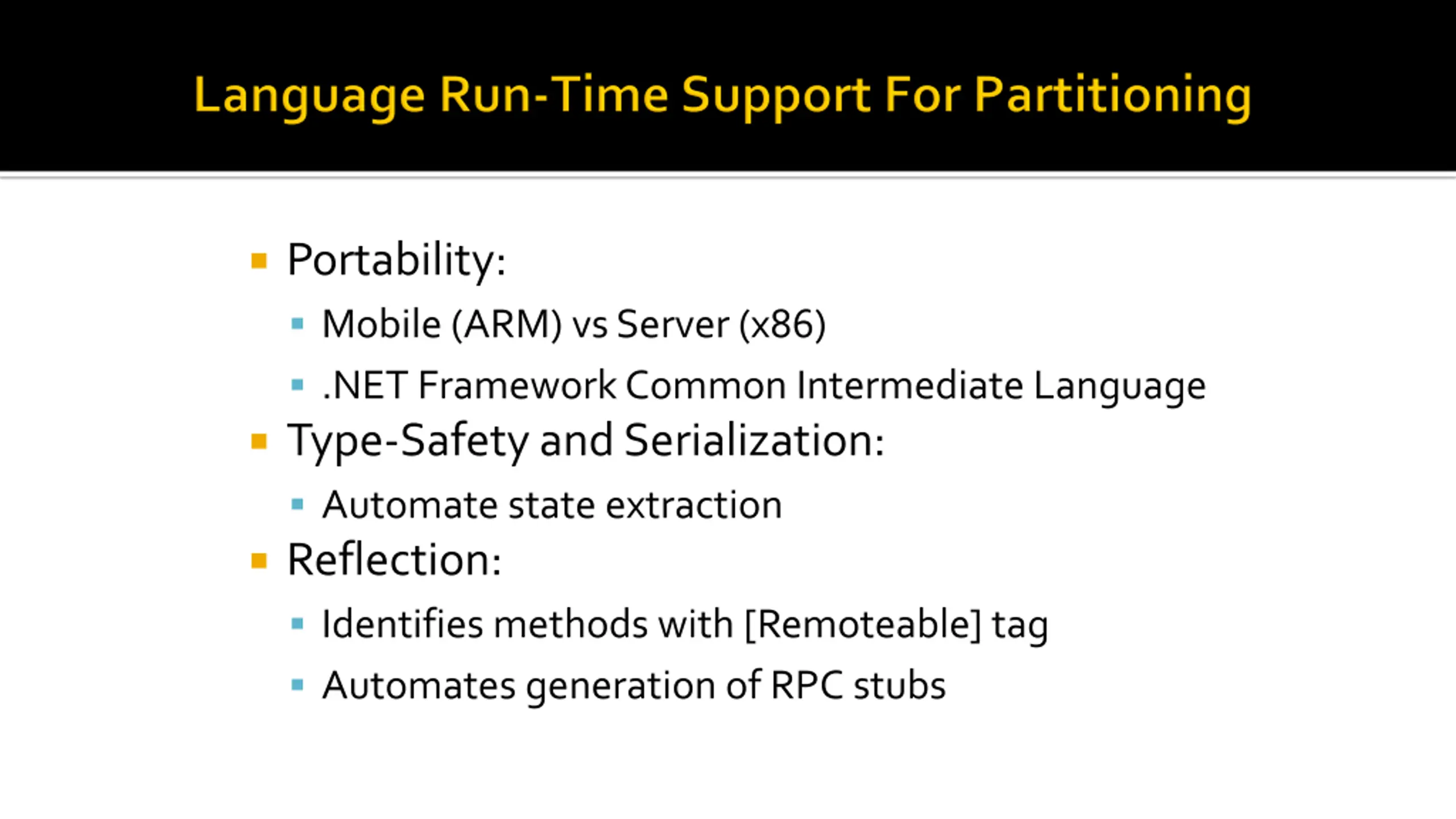Portability: Mobile (ARM) vs Server (x86) .NET Framework Common Intermediate Language Type-Safety and Serialization: Automate state extraction Reflection: Identifies methods with [Remoteable] tag Automates generation of RPC stubs