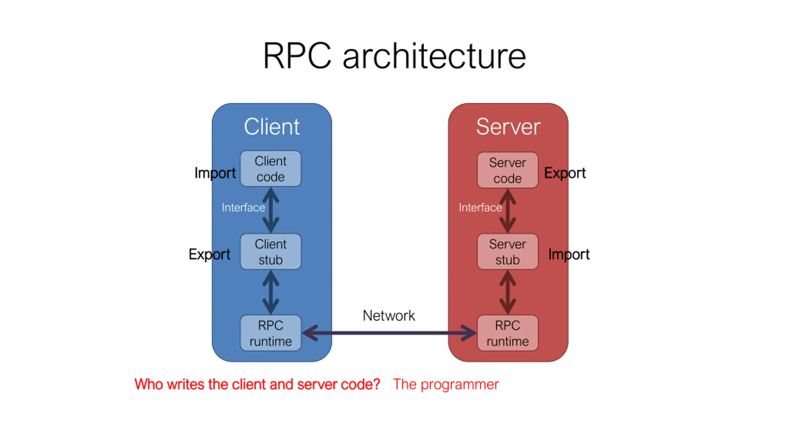 RPC architecture Client Server Client code Server code Import Import Export Export Interface Interface Client stub Server stub Export Export Import Import Network RPC runtime RPC runtime Who writes the client and server code? Who writes the client and server code? The programmer