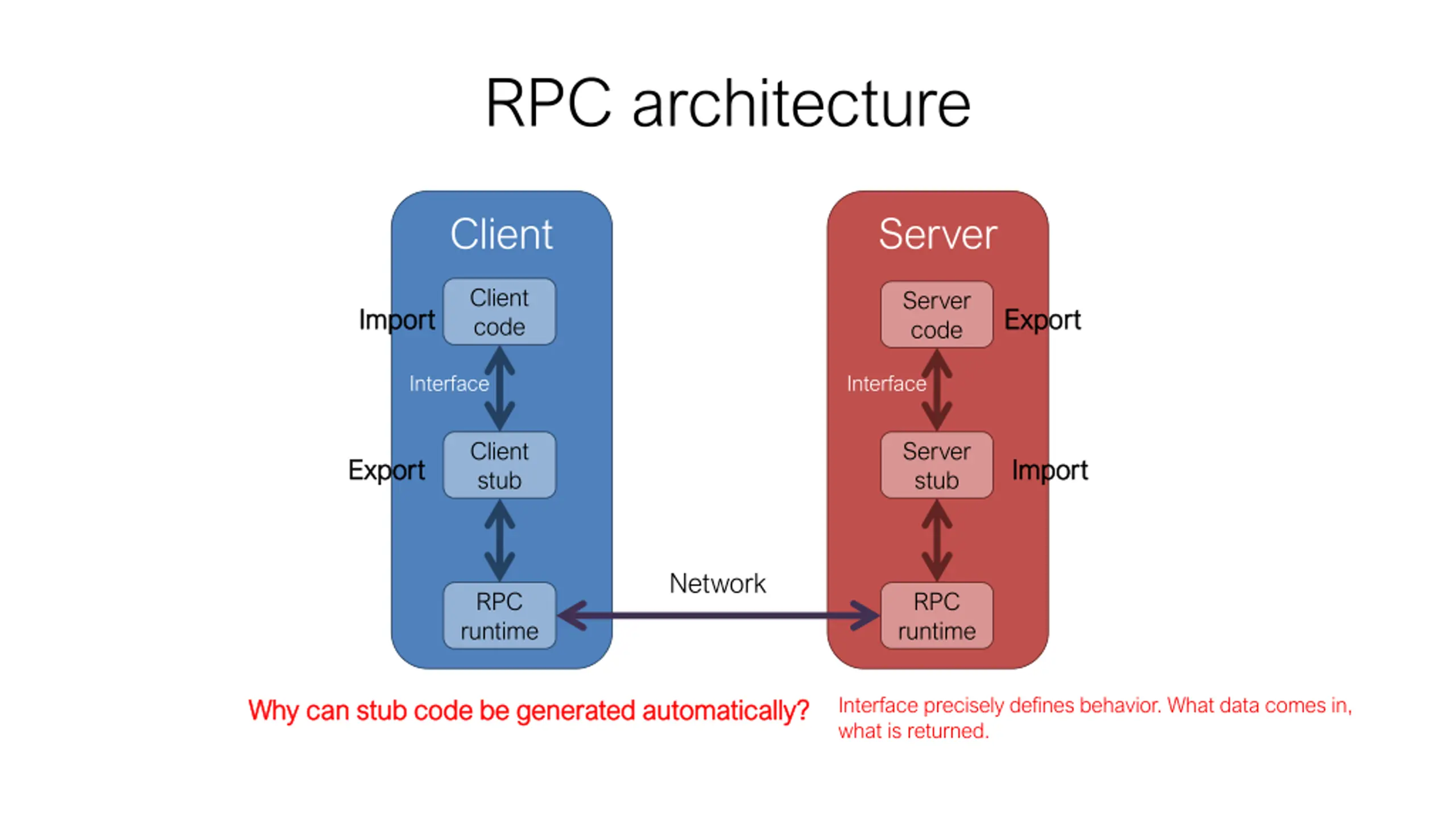 RPC architecture Client Server Client code Server code Import Import Export Export Interface Interface Client stub Server stub Export Export Import Import Network RPC runtime RPC runtime Interface precisely defines behavior. What data comes in, what is returned. Why can stub code be generated automatically? Why can stub code be generated automatically?