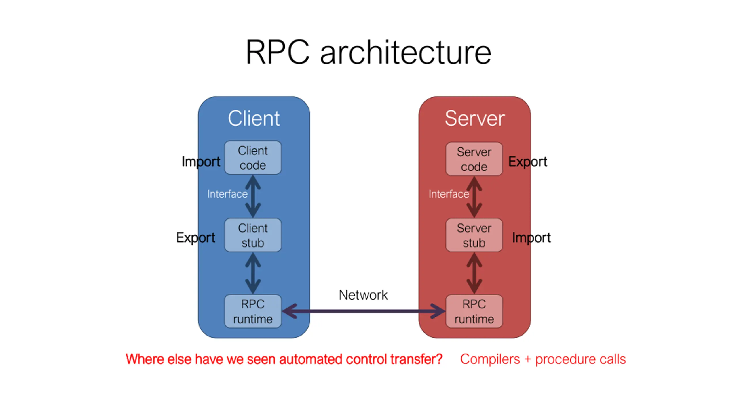 RPC architecture Client Server Client code Server code Import Import Export Export Interface Interface Client stub Server stub Export Export Import Import Network RPC runtime RPC runtime Where else have we seen automated control transfer? Where else have we seen automated control transfer? Compilers + procedure calls