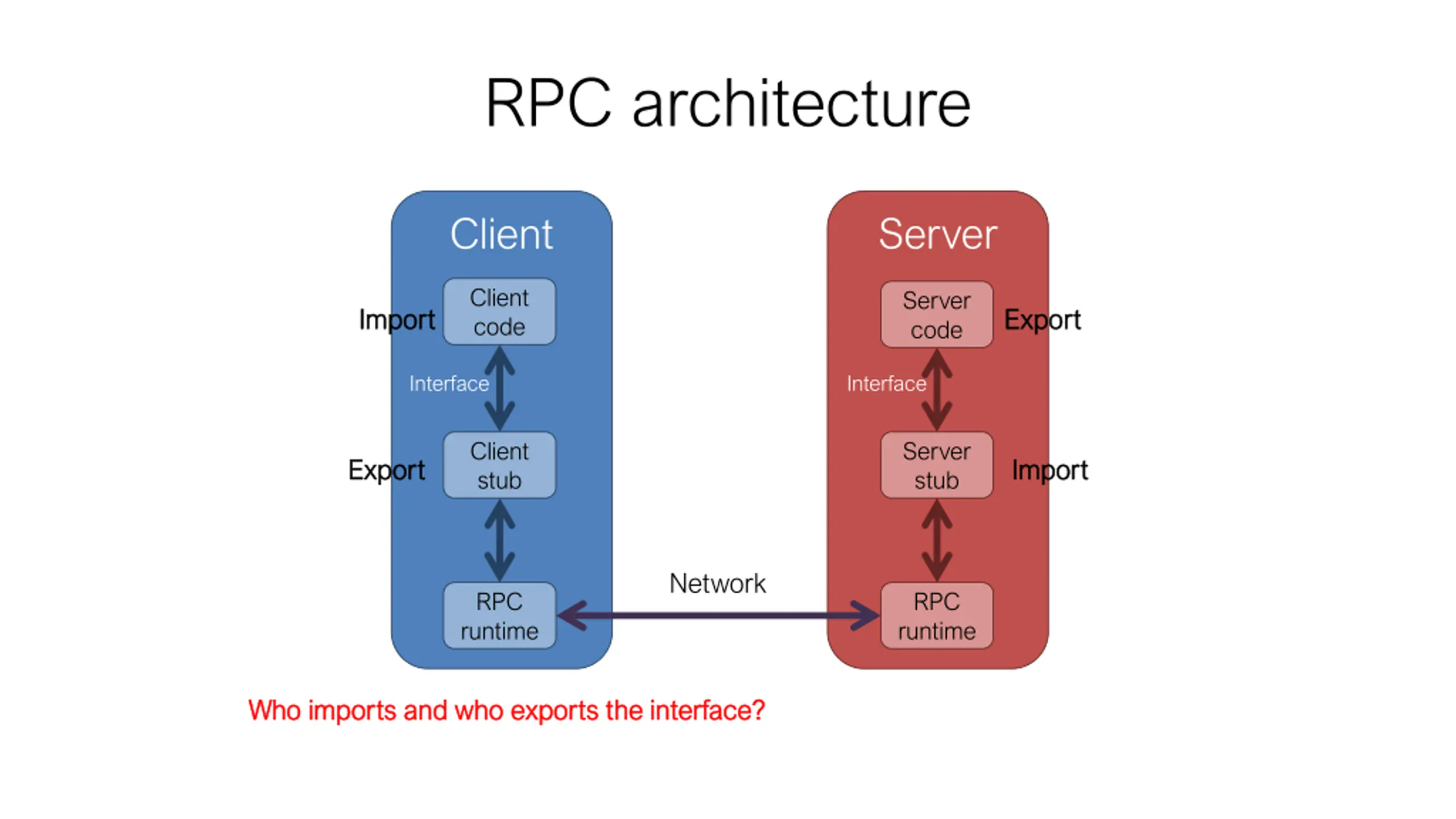 RPC architecture Client Server Client code Server code Import Import Export Export Interface Interface Client stub Server stub Export Export Import Import Network RPC runtime RPC runtime Who imports and who exports the interface? Who imports and who exports the interface?
