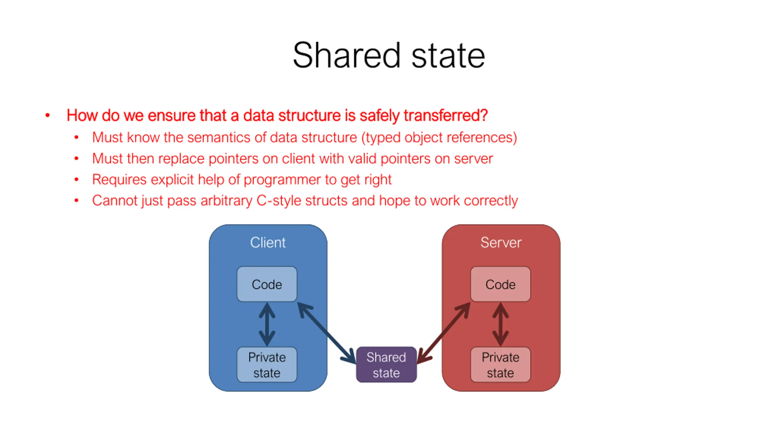 Shared state How do we ensure that a data structure is safely transferred? How do we ensure that a data structure is safely transferred? Must know the semantics of data structure (typed object references) Must then replace pointers on client with valid pointers on server Requires explicit help of programmer to get right Cannot just pass arbitrary C-style structs and hope to work correctly Client Server Code Code Private state Shared state Private state