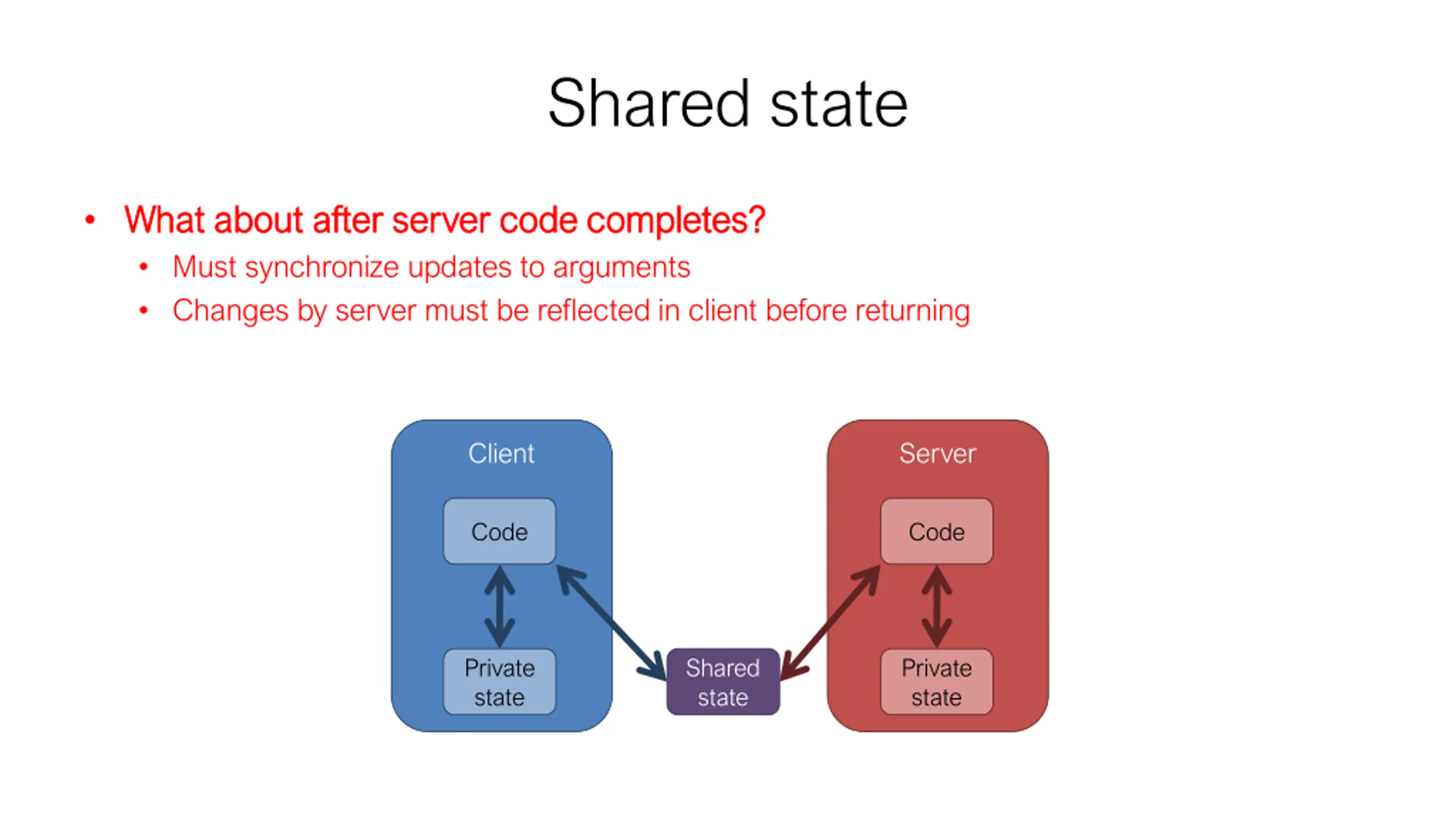 Shared state What about after server code completes? What about after server code completes? Must synchronize updates to arguments Changes by server must be reflected in client before returning Client Server Code Code Private state Shared state Private state