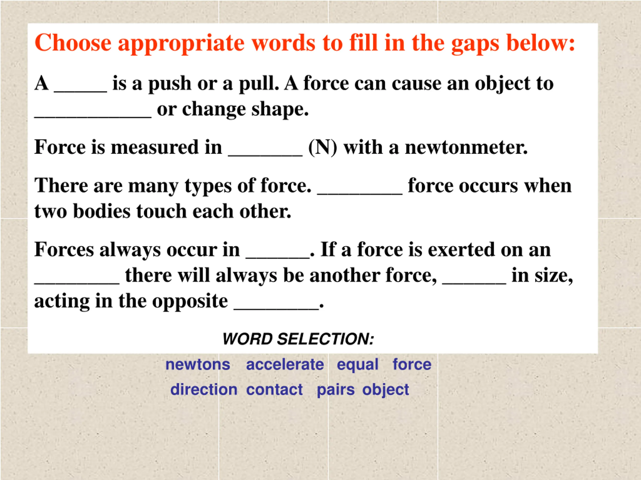 Choose appropriate words to fill in the gaps below: A _____ is a push or a pull. A force can cause an object to ___________ or change shape. accelerate force Force is measured in _______ (N) with a newtonmeter. newtons There are many types of force. ________ force occurs when two bodies touch each other. contact Forces always occur in ______. If a force is exerted on an ________ there will always be another force, ______ in size, acting in the opposite ________. direction pairs object equal WORD SELECTION: newtons direction accelerate equal pairs force contact object