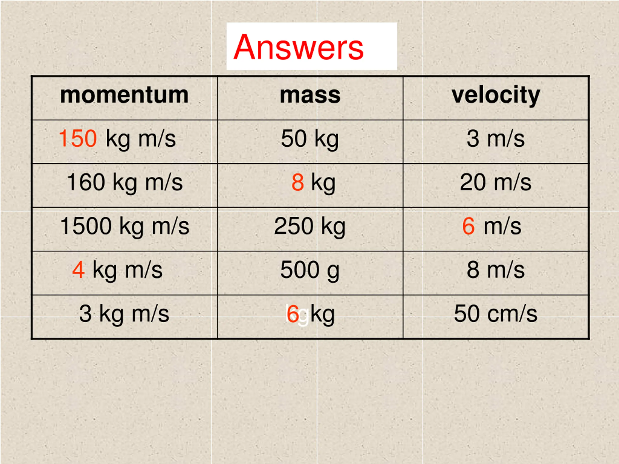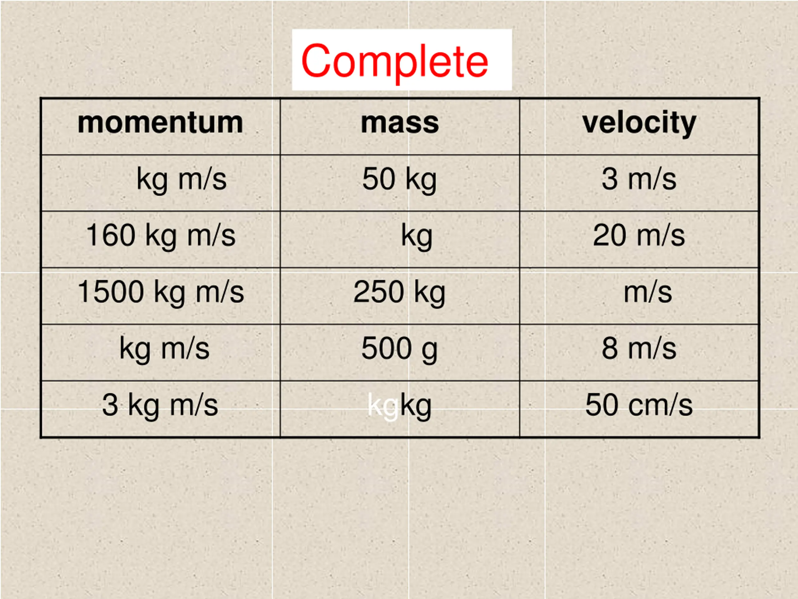 Complete Complete momentum mass velocity kg m/s 50 kg 3 m/s 160 kg m/s kg 20 m/s 1500 kg m/s 250 kg m/s kg m/s 500 g 8 m/s 3 kg m/s kgkg 50 cm/s