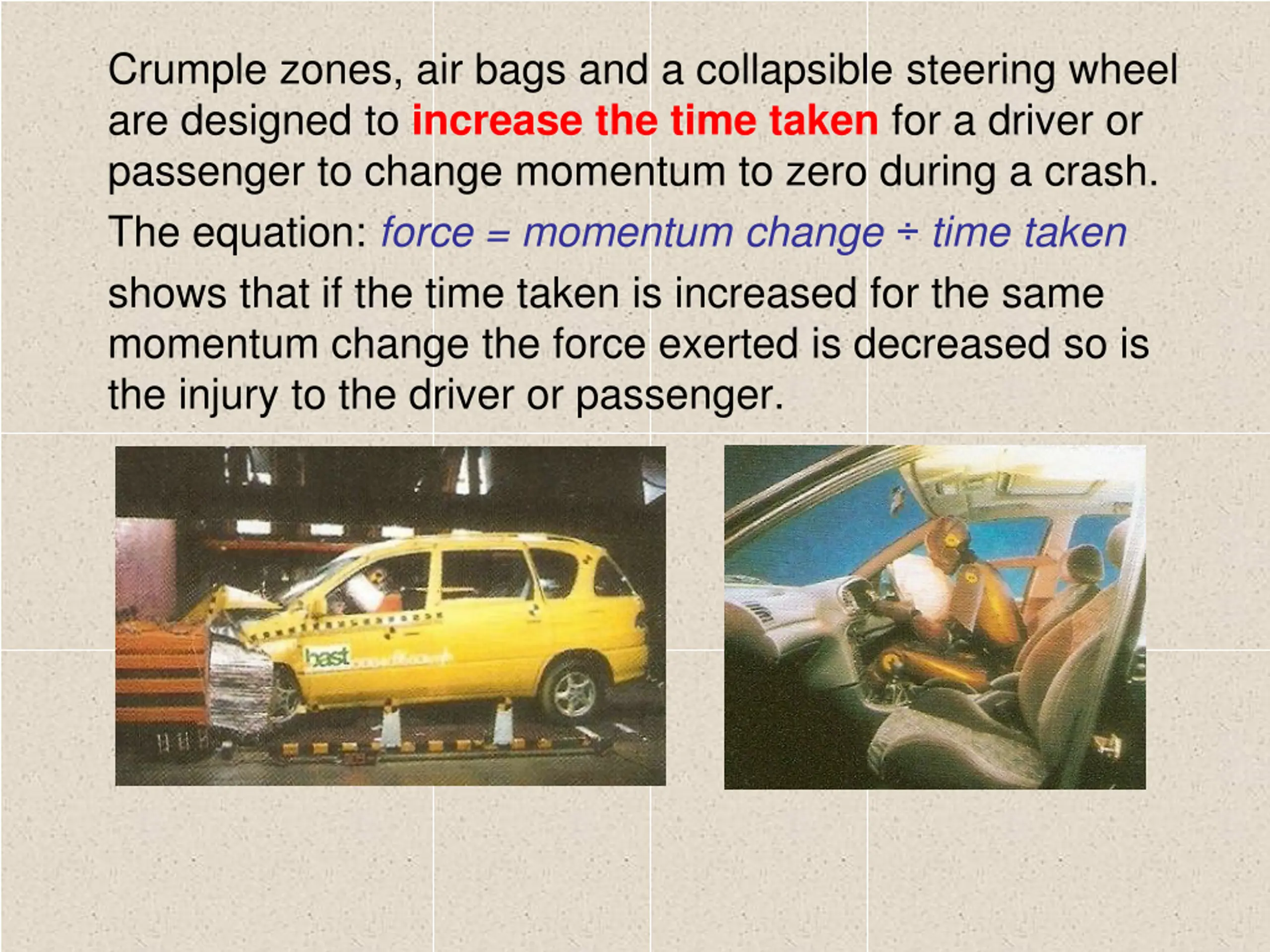 Crumple zones, air bags and a collapsible steering wheel are designed to increase the time taken for a driver or passenger to change momentum to zero during a crash. The equation: force = momentum change time taken shows that if the time taken is increased for the same momentum change the force exerted is decreased so is the injury to the driver or passenger.