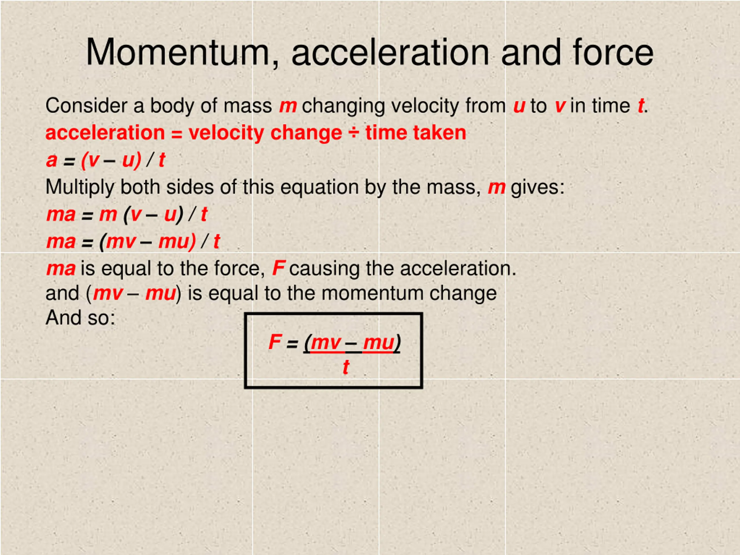 Momentum, acceleration and force Consider a body of mass m changing velocity from u to v in time t. acceleration = velocity change time taken a = (v u) / t Multiply both sides of this equation by the mass, m gives: ma = m (v u) / t ma = (mv mu) / t ma is equal to the force, F causing the acceleration. and (mv mu) is equal to the momentum change And so: F = (mv mu) t