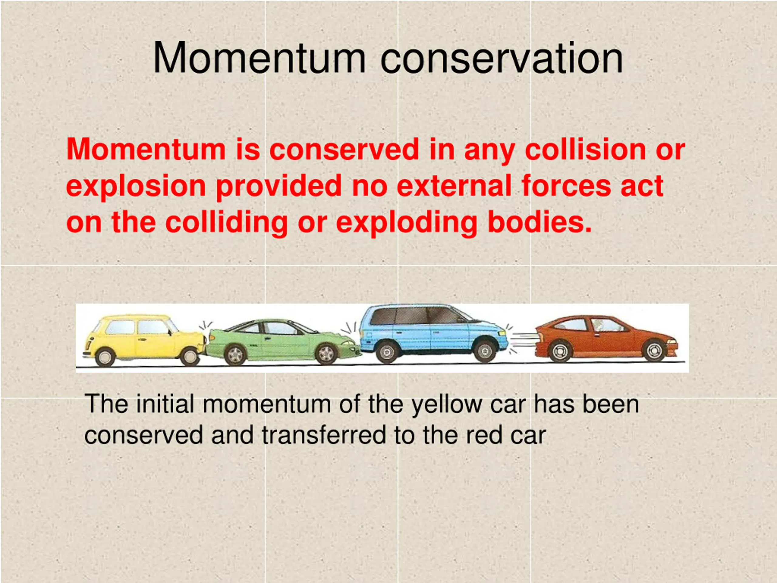 Momentum conservation Momentum is conserved in any collision or explosion provided no external forces act on the colliding or exploding bodies. The initial momentum of the yellow car has been conserved and transferred to the red car