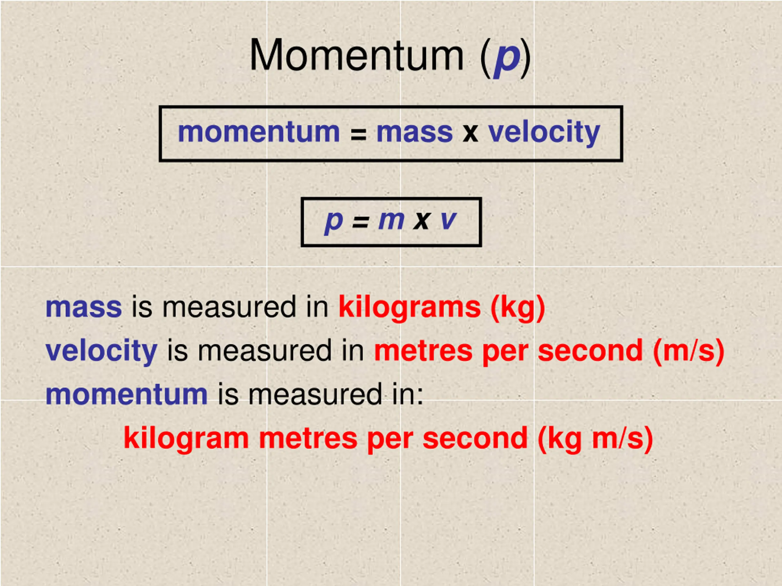 Momentum (p) momentum = mass x velocity p = m x v mass is measured in kilograms (kg) velocity is measured in metres per second (m/s) momentum is measured in: kilogram metres per second (kg m/s)