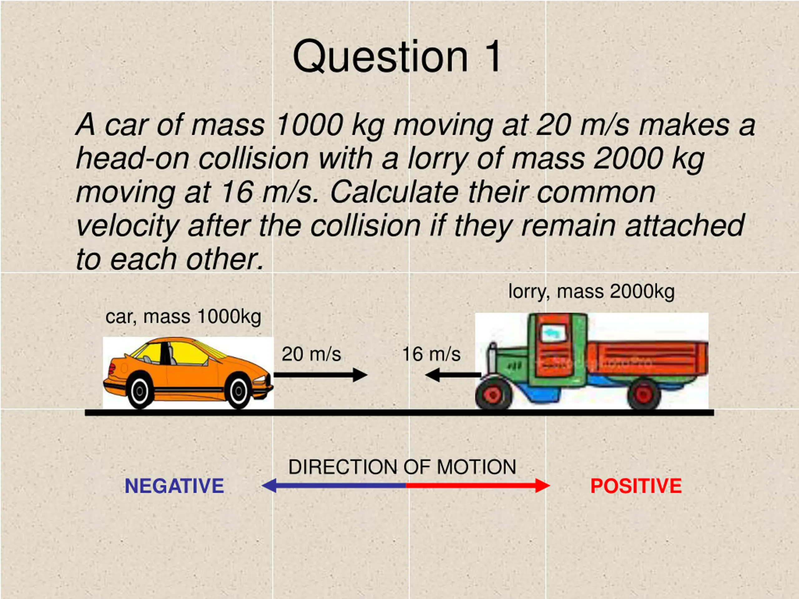 Question 1 A car of mass 1000 kg moving at 20 m/s makes a head-on collision with a lorry of mass 2000 kg moving at 16 m/s. Calculate their common velocity after the collision if they remain attached to each other. lorry, mass 2000kg car, mass 1000kg 20 m/s 16 m/s DIRECTION OF MOTION NEGATIVE POSITIVE