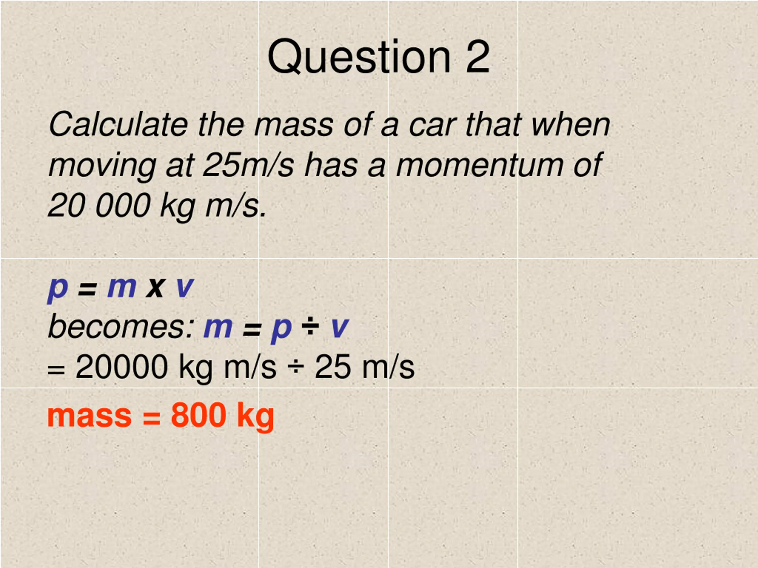 Question 2 Calculate the mass of a car that when moving at 25m/s has a momentum of 20 000 kg m/s. p = m x v becomes:m = p v = 20000 kg m/s 25 m/s mass = 800 kg