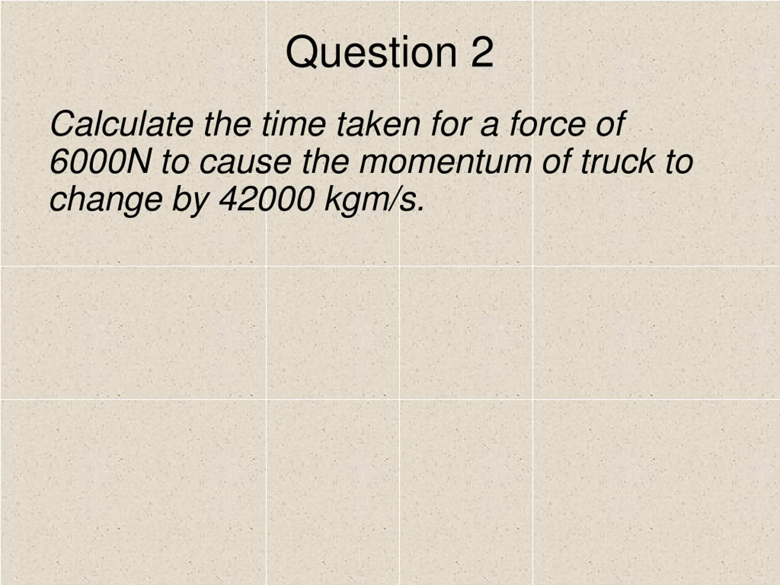 Question 2 Calculate the time taken for a force of 6000N to cause the momentum of truck to change by 42000 kgm/s.