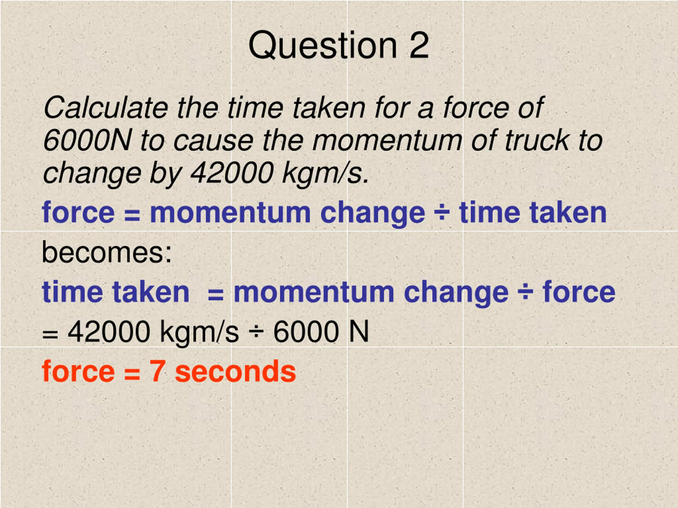 Question 2 Calculate the time taken for a force of 6000N to cause the momentum of truck to change by 42000 kgm/s. force = momentum change time taken becomes: time taken = momentum change force = 42000 kgm/s 6000 N force = 7 seconds