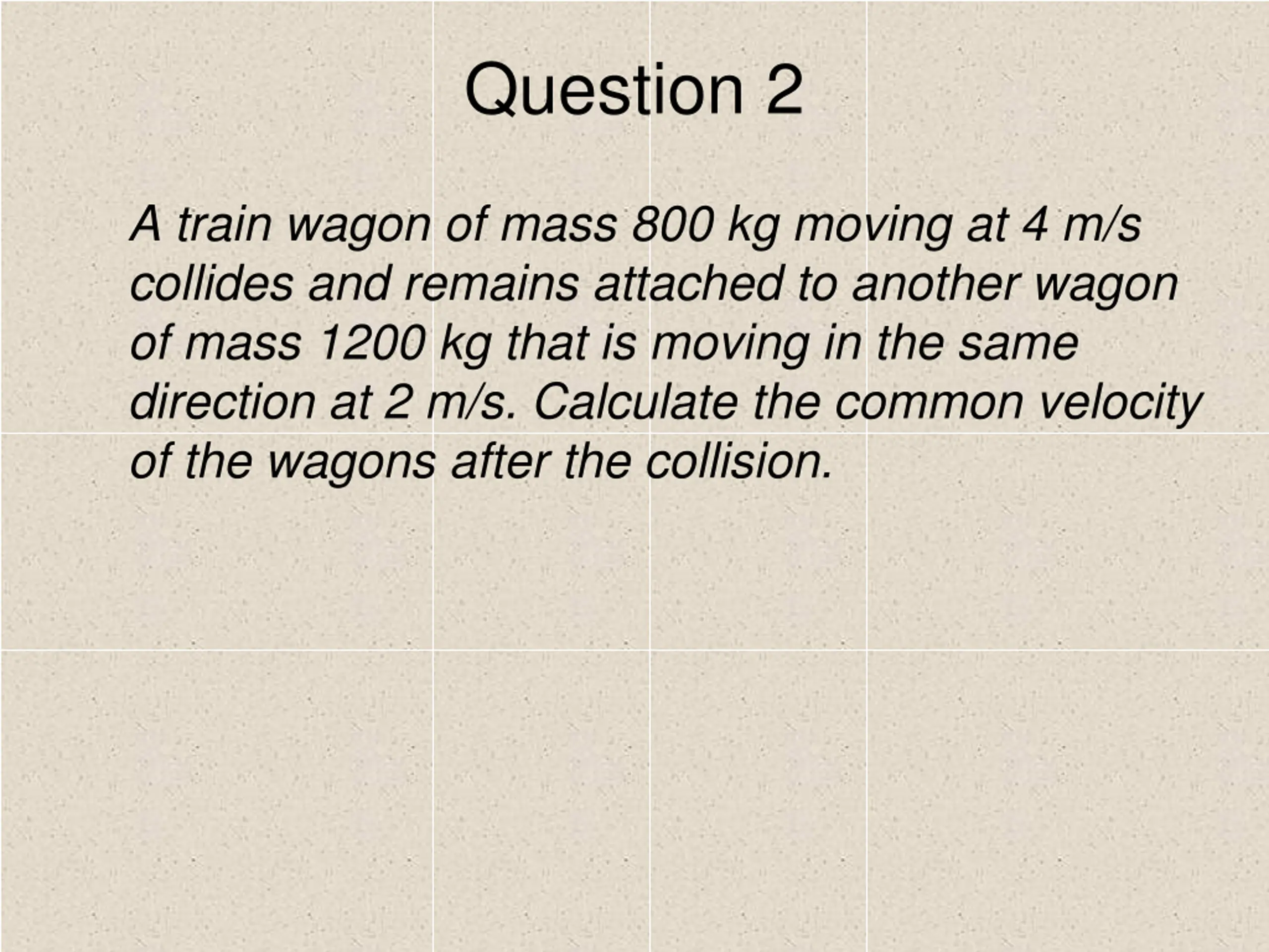 Question 2 A train wagon of mass 800 kg moving at 4 m/s collides and remains attached to another wagon of mass 1200 kg that is moving in the same direction at 2 m/s. Calculate the common velocity of the wagons after the collision.