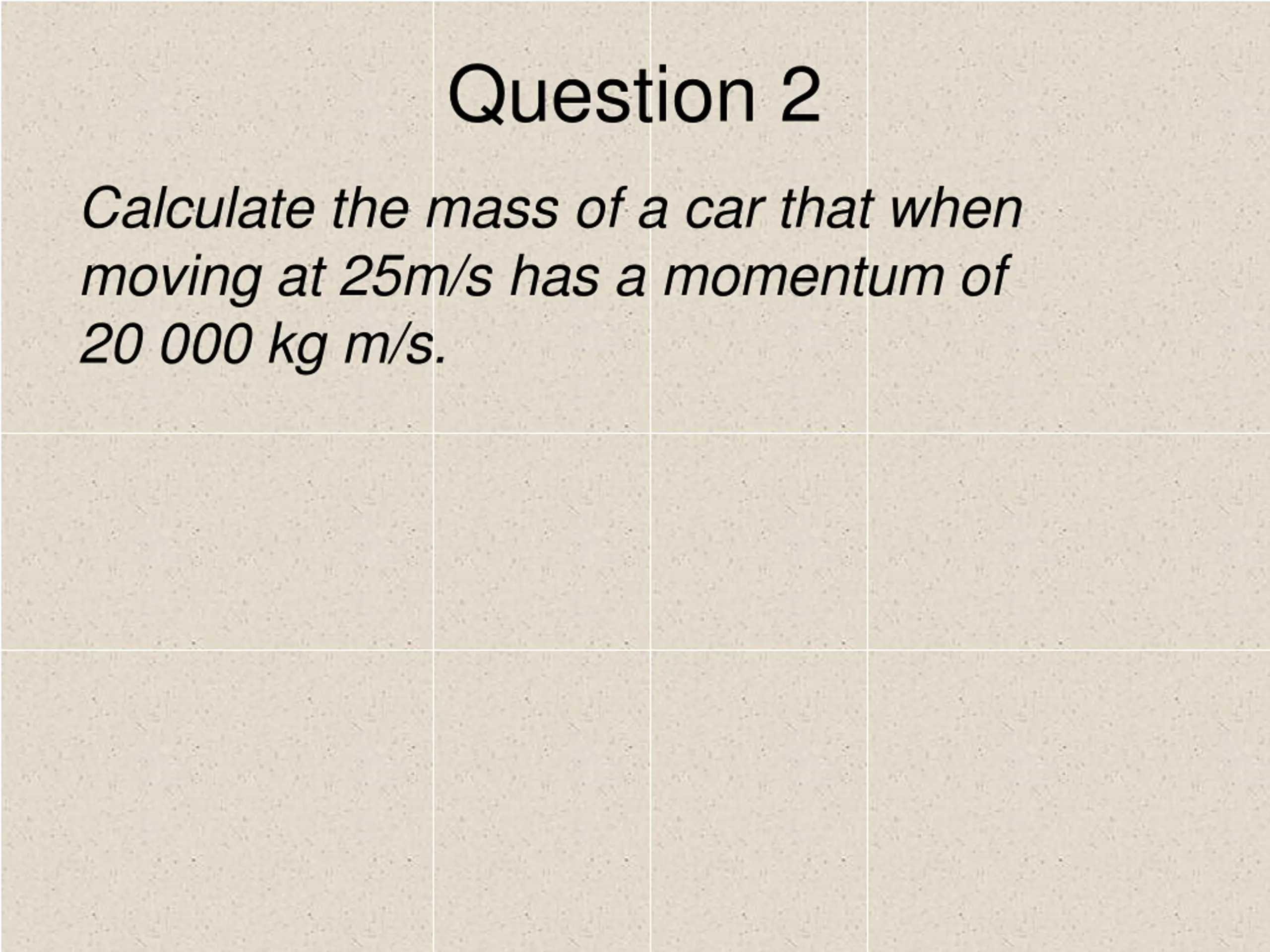 Question 2 Calculate the mass of a car that when moving at 25m/s has a momentum of 20 000 kg m/s.