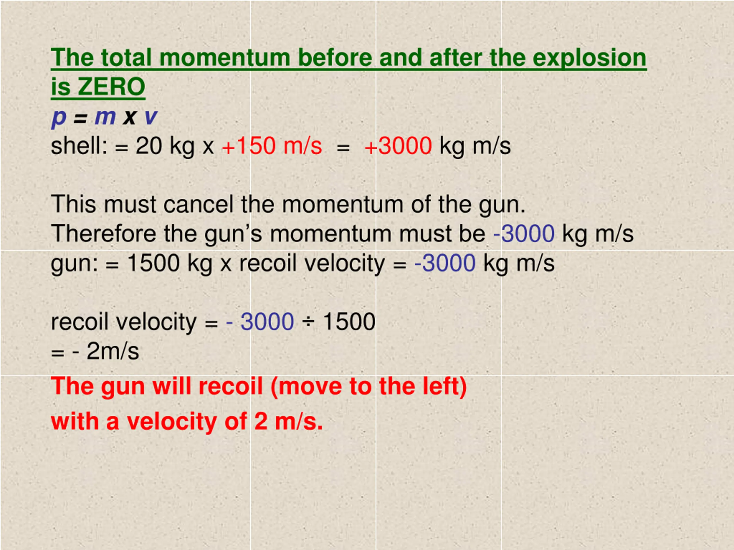 The total momentum before and after the explosion is ZERO p = m x v shell: = 20 kg x +150 m/s = +3000 kg m/s This must cancel the momentum of the gun. Therefore the gun s momentum must be -3000 kg m/s gun: = 1500 kg x recoil velocity = -3000 kg m/s recoil velocity = - 3000 1500 = - 2m/s The gun will recoil (move to the left) with a velocity of 2 m/s.