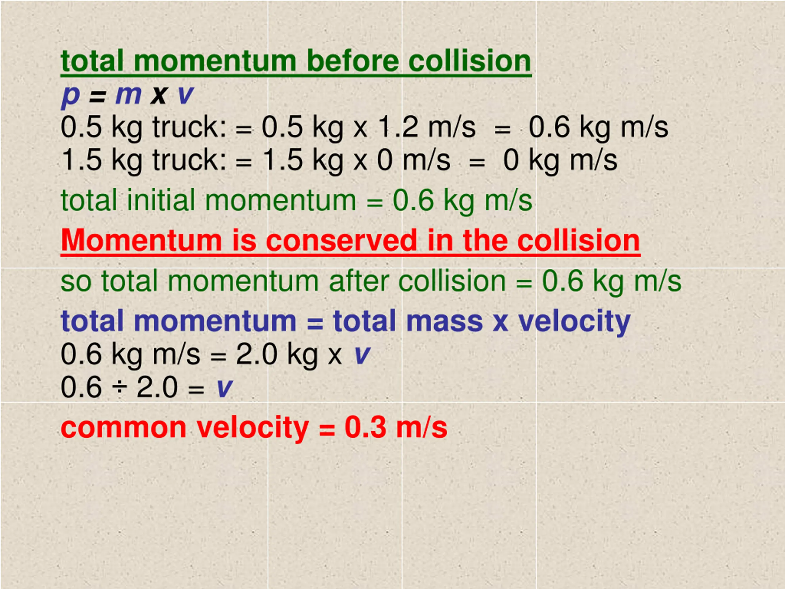 total momentum before collision p = m x v 0.5 kg truck: = 0.5 kg x 1.2 m/s = 0.6 kg m/s 1.5 kg truck: = 1.5 kg x 0 m/s = 0 kg m/s total initial momentum = 0.6 kg m/s Momentum is conserved in the collision so total momentum after collision = 0.6 kg m/s total momentum = total mass x velocity 0.6 kg m/s = 2.0 kg x v 0.6 2.0 = v common velocity = 0.3 m/s