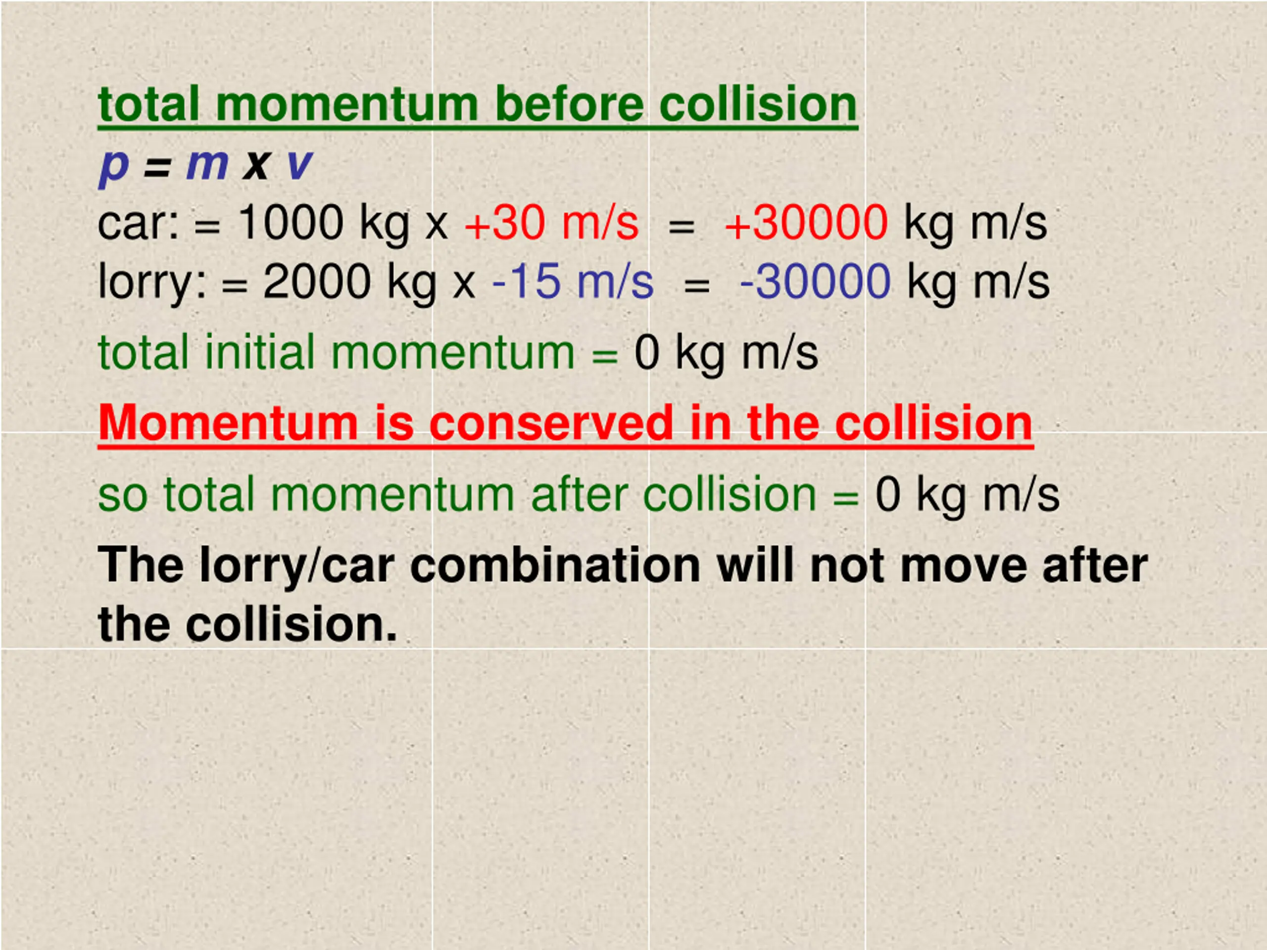 total momentum before collision p = m x v car: = 1000 kg x +30 m/s = +30000 kg m/s lorry: = 2000 kg x -15 m/s = -30000 kg m/s total initial momentum = 0 kg m/s Momentum is conserved in the collision so total momentum after collision = 0 kg m/s The lorry/car combination will not move after the collision.