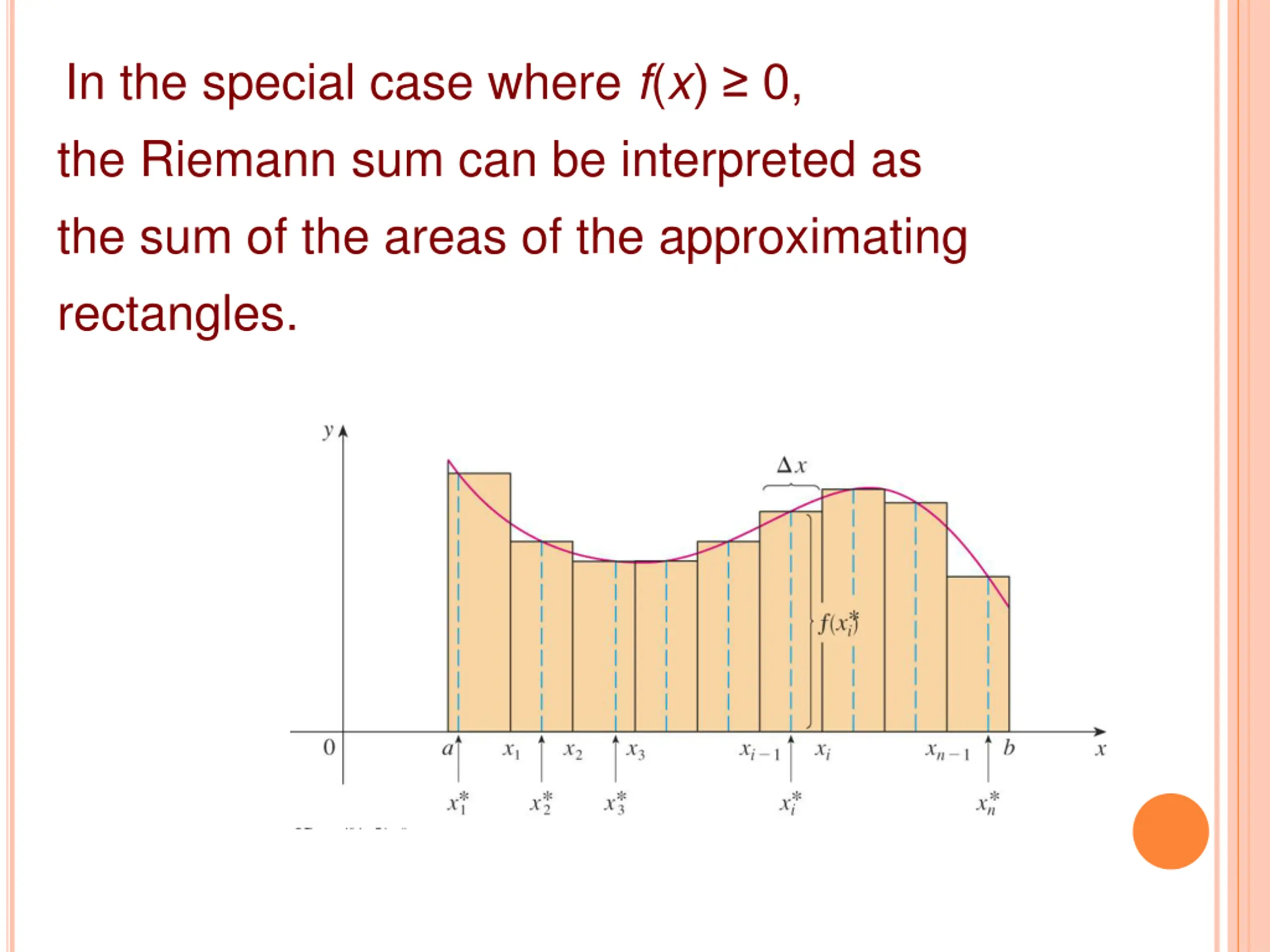 In the special case where f(x) 0, the Riemann sum can be interpreted as the sum of the areas of the approximating rectangles.
