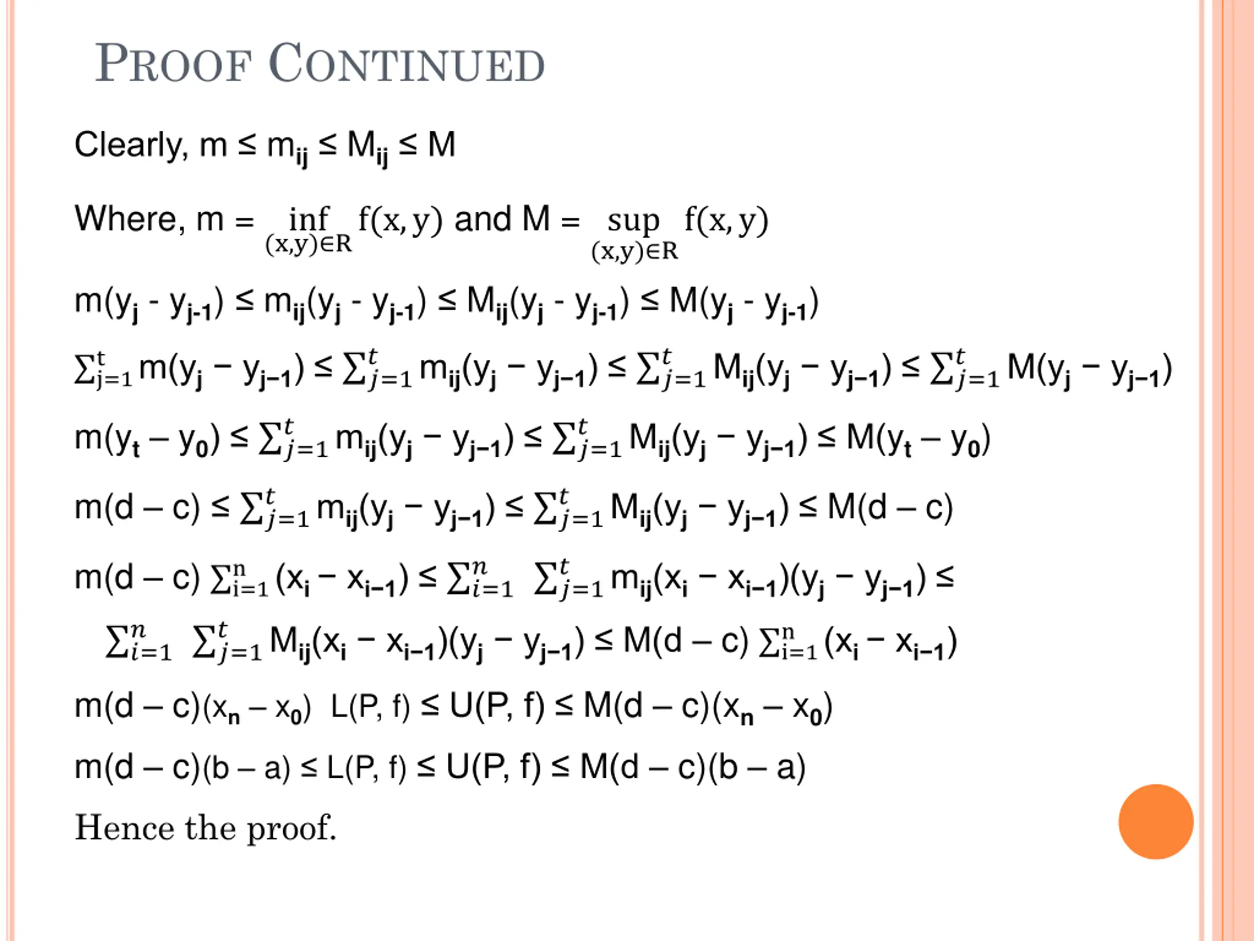 PROOF CONTINUED Clearly, m mij Mij M Where, m = inf (x,y) Rf(x,y) and M = sup (x,y) Rf(x,y) m(yj- yj-1) mij(yj- yj-1) Mij(yj- yj-1) M(yj- yj-1) ? ? ? m(yj yj 1) ?=1 mij(yj yj 1) ?=1 Mij(yj yj 1) ?=1 M(yj yj 1) t j=1 ? ? m(yt y0) ?=1 Mij(yj yj 1) M(yt y0) mij(yj yj 1) ?=1 ? ? m(d c) ?=1 Mij(yj yj 1) M(d c) mij(yj yj 1) ?=1 ? ? m(d c) i=1 n(xi xi 1) ?=1 Mij(xi xi 1)(yj yj 1) M(d c) i=1 mij(xi xi 1)(yj yj 1) ?=1 ? ? n(xi xi 1) ?=1 ?=1 m(d c)(xn x0) L(P, f) U(P, f) M(d c)(xn x0) m(d c)(b a) L(P, f) U(P, f) M(d c)(b a) Hence the proof.