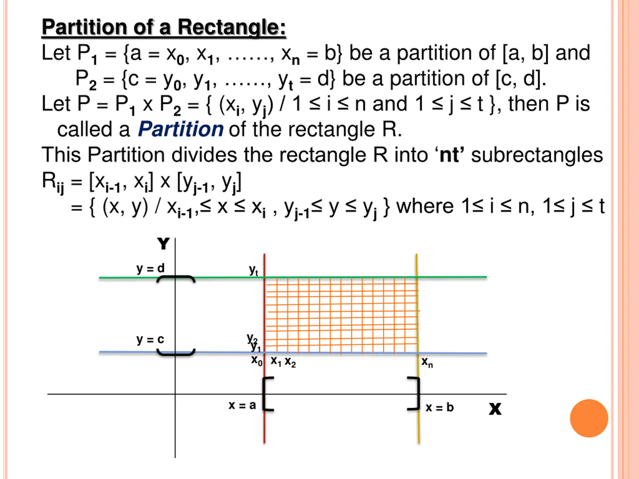 Partition of a Rectangle: Let P1= {a = x0, x1, , xn= b} be a partition of [a, b] and P2= {c = y0, y1, , yt= d} be a partition of [c, d]. Let P = P1x P2= { (xi, yj) / 1 i n and 1 j t }, then P is called a Partition of the rectangle R. This Partition divides the rectangle R into nt subrectangles Rij= [xi-1, xi] x [yj-1, yj] = { (x, y) / xi-1, x xi, yj-1 y yj} where 1 i n, 1 j t Y Y y = d yt y2 y = c y1 x0 x1x2 xn X X x = a x = b
