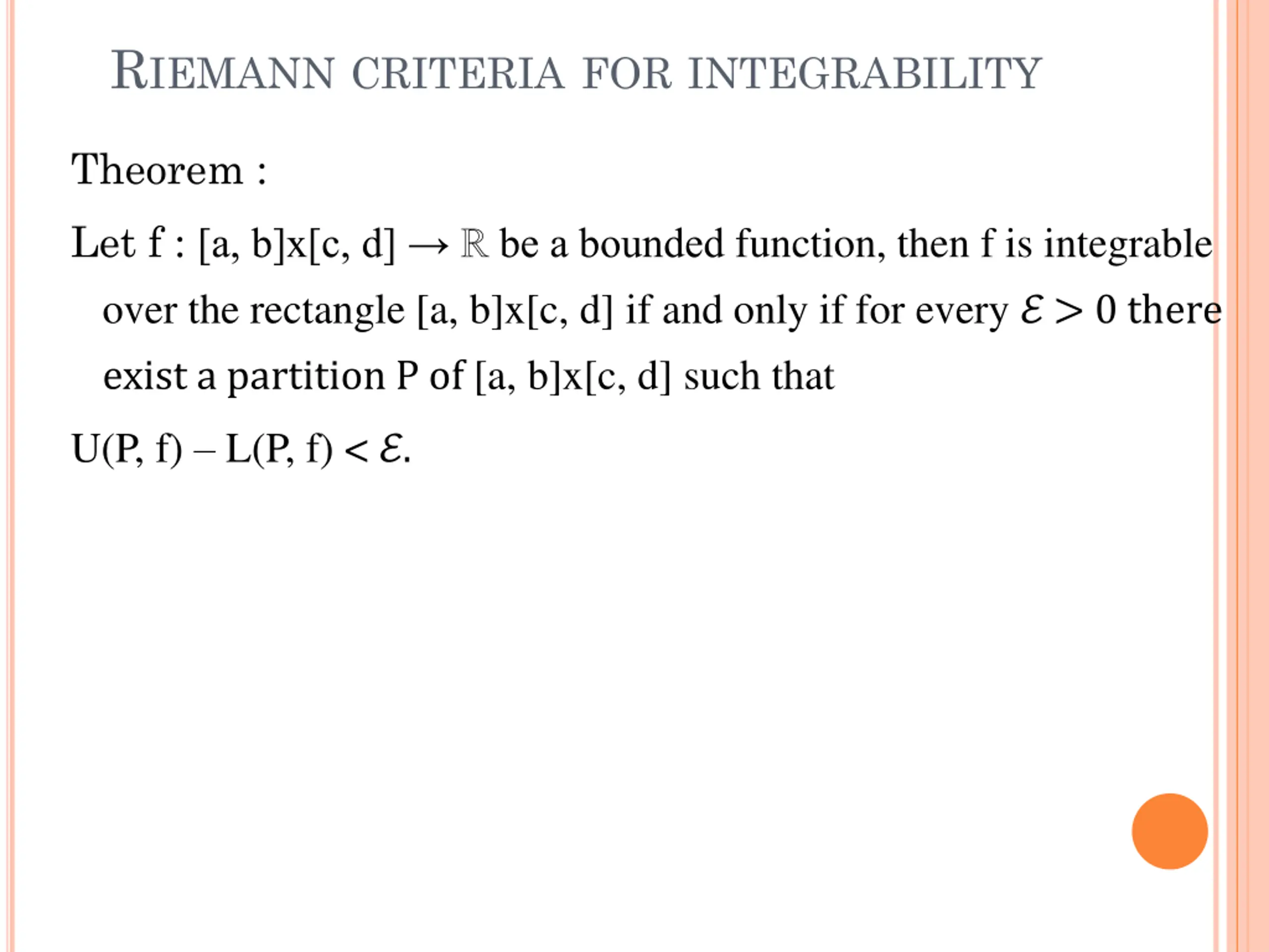 RIEMANN CRITERIA FOR INTEGRABILITY Theorem : Let f : [a, b]x[c, d] be a bounded function, then f is integrable over the rectangle [a, b]x[c, d] if and only if for every > 0 there exist a partition P of [a, b]x[c, d] such that U(P, f) L(P, f) < .